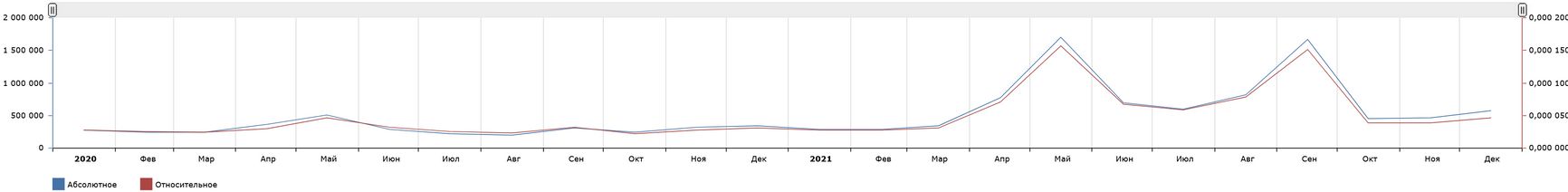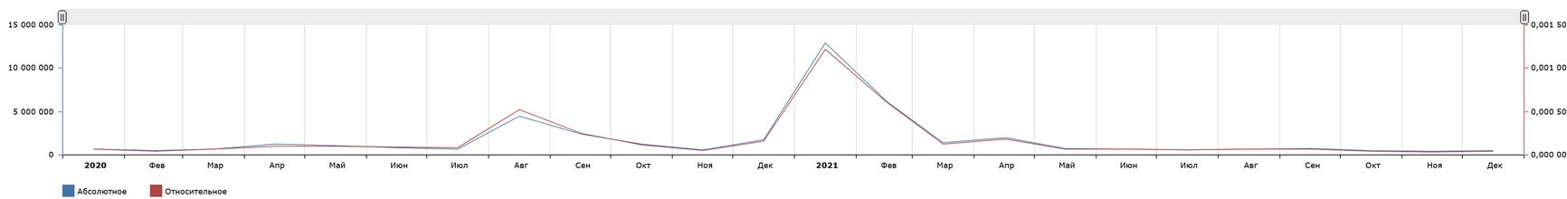 Здесь очевидны два пика, связанные с информационными поводами: в августе 2020 года Навального отравили, в январе 2021 года он вернулся в Россию после лечения и тут же был арестован, что вызвало массовые протесты; в те же дни был выпущен фильм-расследование Навального «Дворец для Путина». Интересно, что в январе по количеству запросов в «Яндексе» Навальный превзошел Путина: 12 498 451 против 11 210 038. Но в те недели, когда таких громких событий нет, количество поисковых запросов естественным образом возвращается к базовому уровню. 437 382 запроса в ноябре 2021 года — действительно самый низкий результат за два года, но уже в декабре зафиксирован 491 841 запрос, что превосходит уровень февраля 2020 года, так что корректно было бы говорить не о падении интереса пользователей Рунета к Навальному, а о стабильном интересе в промежутках между громкими информационными поводами.