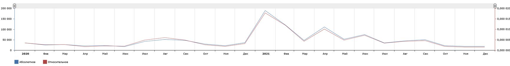 Меньше интересовались Фондом борьбы с коррупцией только в июне 2020 года — в период традиционного летнего затишья. Тогда этот показатель составил 18 138 запросов по ключевому слову. Таким образом, к концу 2021 года рейтинг ФБК практически сравнялся с уровнем начала прошлогодних летних отпусков.