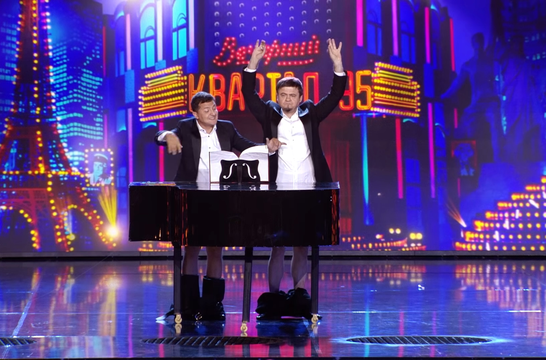 В программе показан фрагмент шоу «Вечерний квартал», в котором Зеленский с партнером повторяют номер американского комического дуэта The Freaking Brothers с имитацией игры на рояле с помощью интимной части тела. Юмор, конечно, не высшей пробы, но не в этом дело. В номере звучит гимн Украины, а Зеленский при этом неритмично, поперек музыки, дергается и по ходу исполнения совершенно невпопад кричит «Mesdames et messieurs, attention!» Объясняется это просто: на самом деле никакого гимна Украины в номере «Вечернего квартала» не было. Неизвестный умелец подложил музыку под видеозапись «Вечернего квартала» 2016 года. В оригинальной записи, так же, как и у американских комиков, выступление делится на три музыкальных фрагмента: звучат примитивный вальс, известный как Chopsticks, хабанера из «Кармен» и «Хава нагила».
