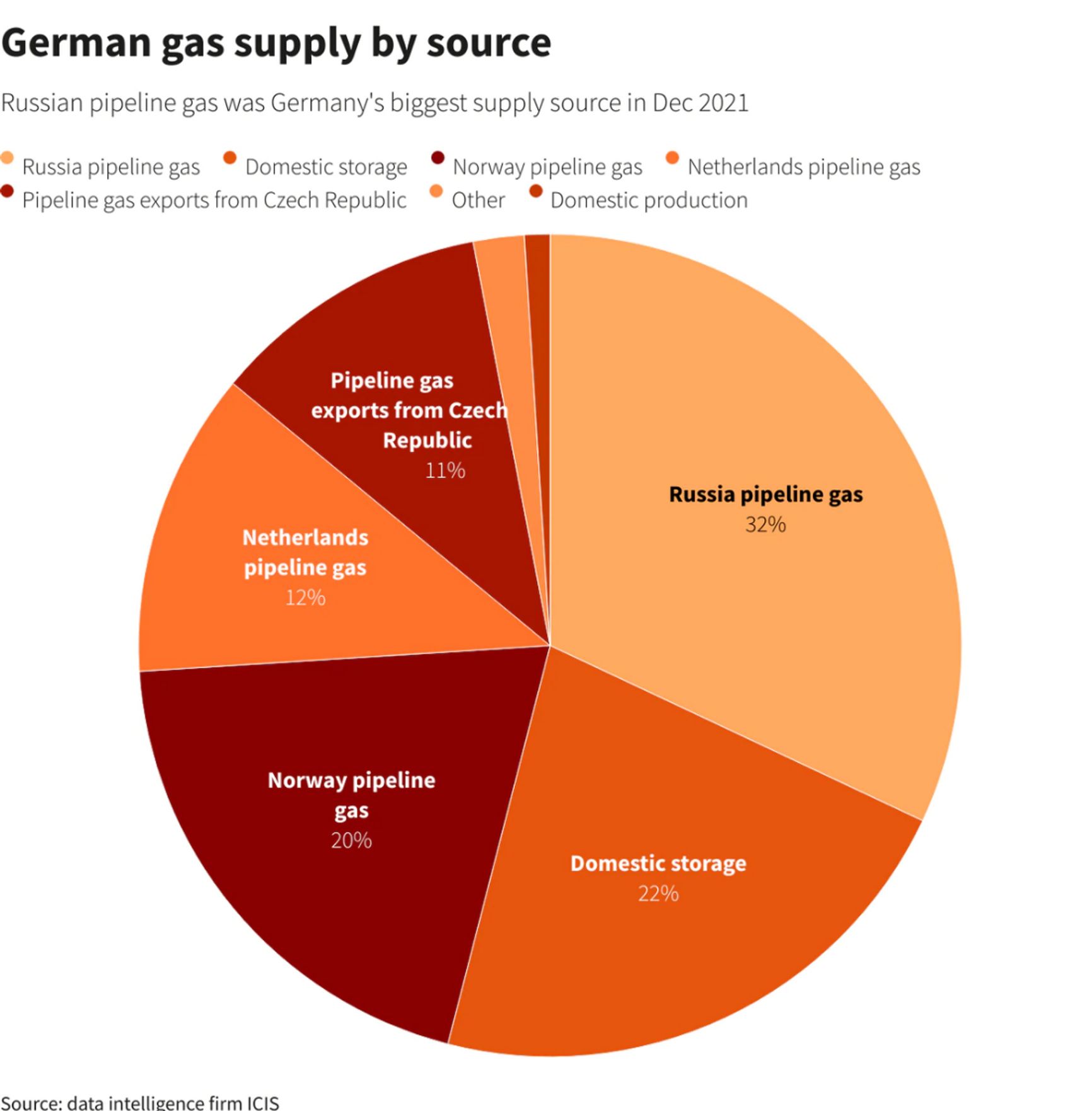 Долю российского поставщика в газовом балансе Германии Киселев несколько преувеличил. Недавно Reuters опубликовало данные за декабрь 2021 года. Россия — действительно крупнейший поставщик газа на рынок Германии, но из всего потребленного за месяц в Германии газа на ее долю приходится 32%.