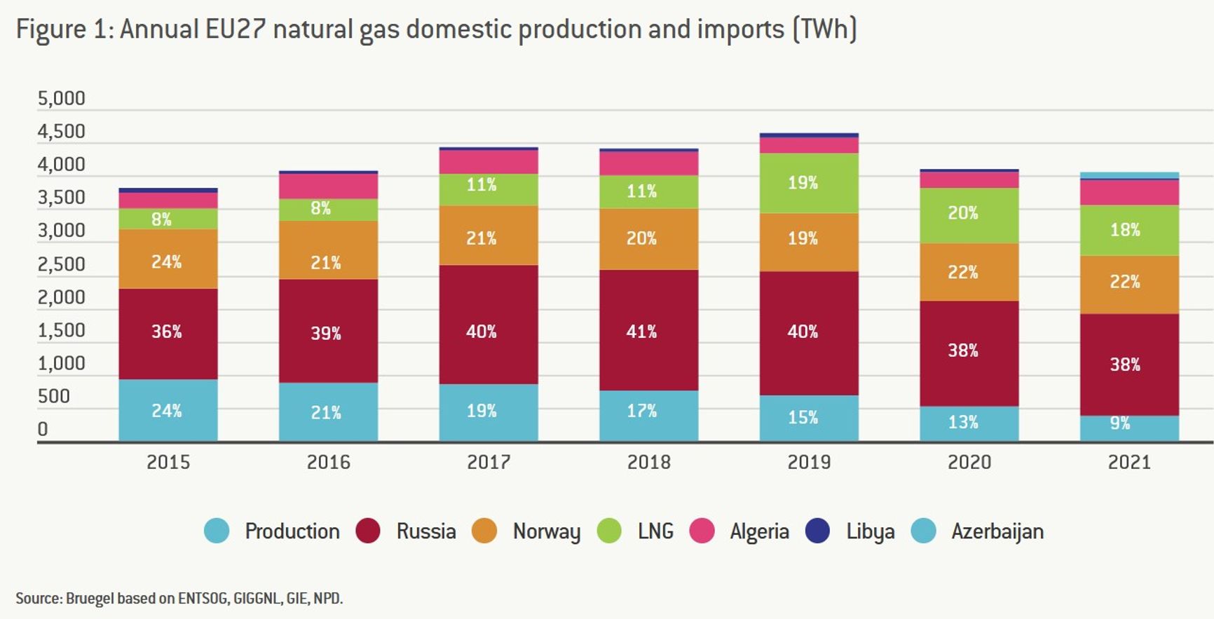 Правда, 22% потребления — это газ из расположенных в Германии хранилищ, а их тоже надо чем-то наполнять. Но даже если рассматривать только газ, полученный Германией в декабре из других стран, российского окажется только около 41%. Это, кстати, примерно соответствует месту российского импорта в газовом балансе ЕС в целом: в последние годы его доля варьировалась от 36% до 41%.