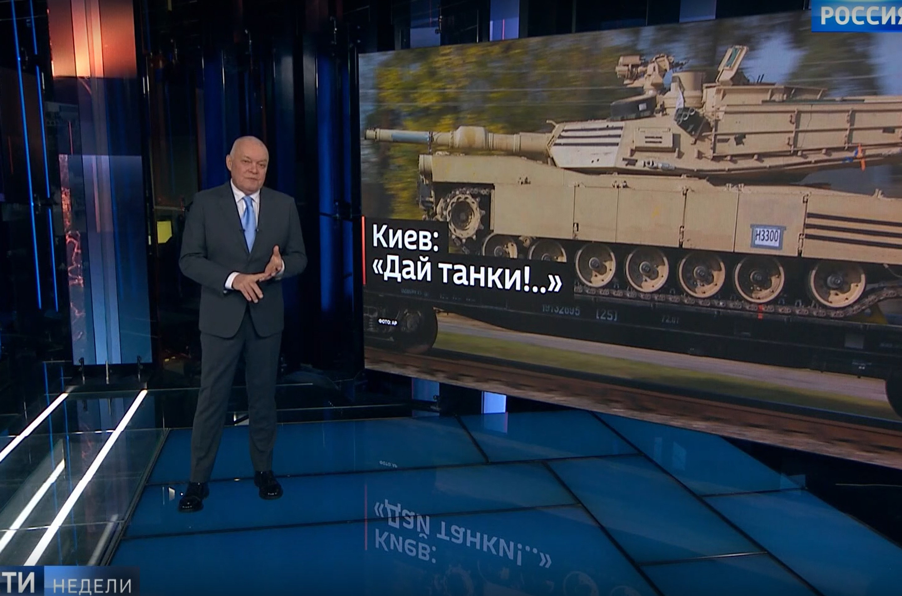 «Вести недели» в сюжете о поставках западных танков Украине «нашли» причину, по которой США не передают ВСУ тяжелый танк Abrams: оказывается, он не может передвигаться по снегу. Ведущий Дмитрий Киселев даже сравнил его с коровой на льду. В сюжете говорится:
