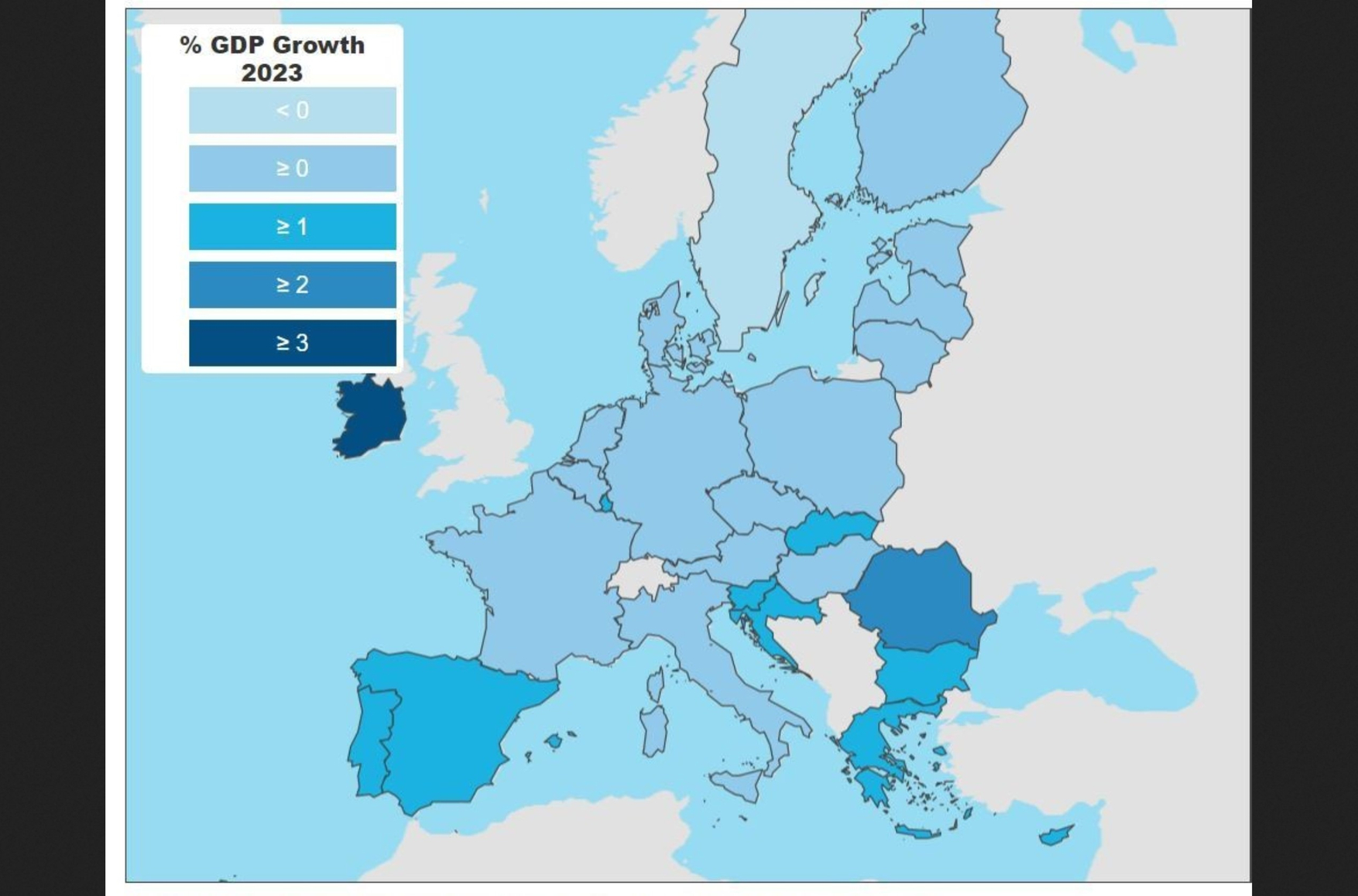 Опубликован также и прогноз по каждой из стран ЕС. Падение ВВП по итогам 2023 года ожидается только в двух из них — Швеции (на 0,5%) и Эстонии (0,4%). Во всех остальных ВВП вырастет; самый большой рост прогнозируется в Ирландии (5,5%). В крупнейших экономиках ЕС ожидается небольшой, но все же рост ВВП: в Германии на 0,2%, во Франции на 0,7%, в Италии на 1,2%. В 2024 году предвидится рост ВВП во всех странах ЕС.