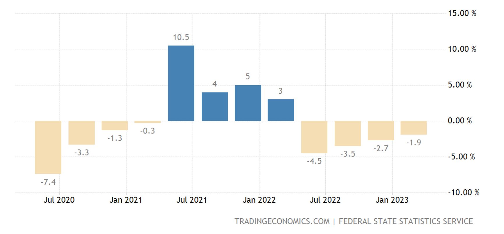Что касается ВВП России, Банк России в конце апреля предсказал рост в диапазоне 0,5%–2%, Министерство экономики — рост на 1,2%, «Сбер» — на 1%, МВФ — на 0,7%. При этом Trading Economics отмечает, что в I квартале 2023 года российский ВВП снизился на 1,9% по сравнению с соответствующим периодом прошлого года.