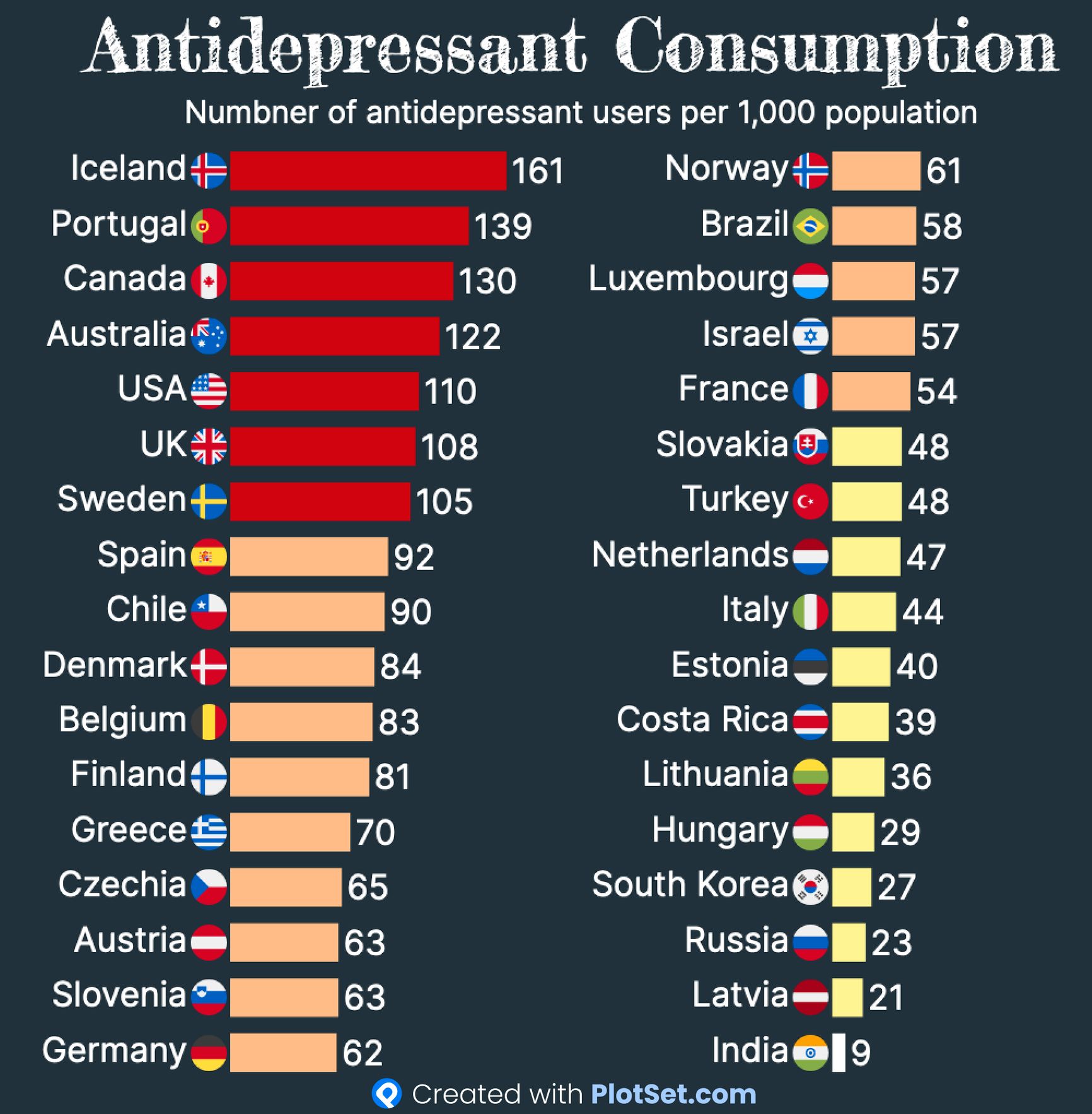 В одних странах люди прибегают к антидепрессантам более охотно, в других менее; так, в 2023 году потребление этих средств на душу населения в Исландии оказалось почти вчетверо выше, чем в Италии. В России их принимают довольно редко — вдвое ниже, чем в Италии.