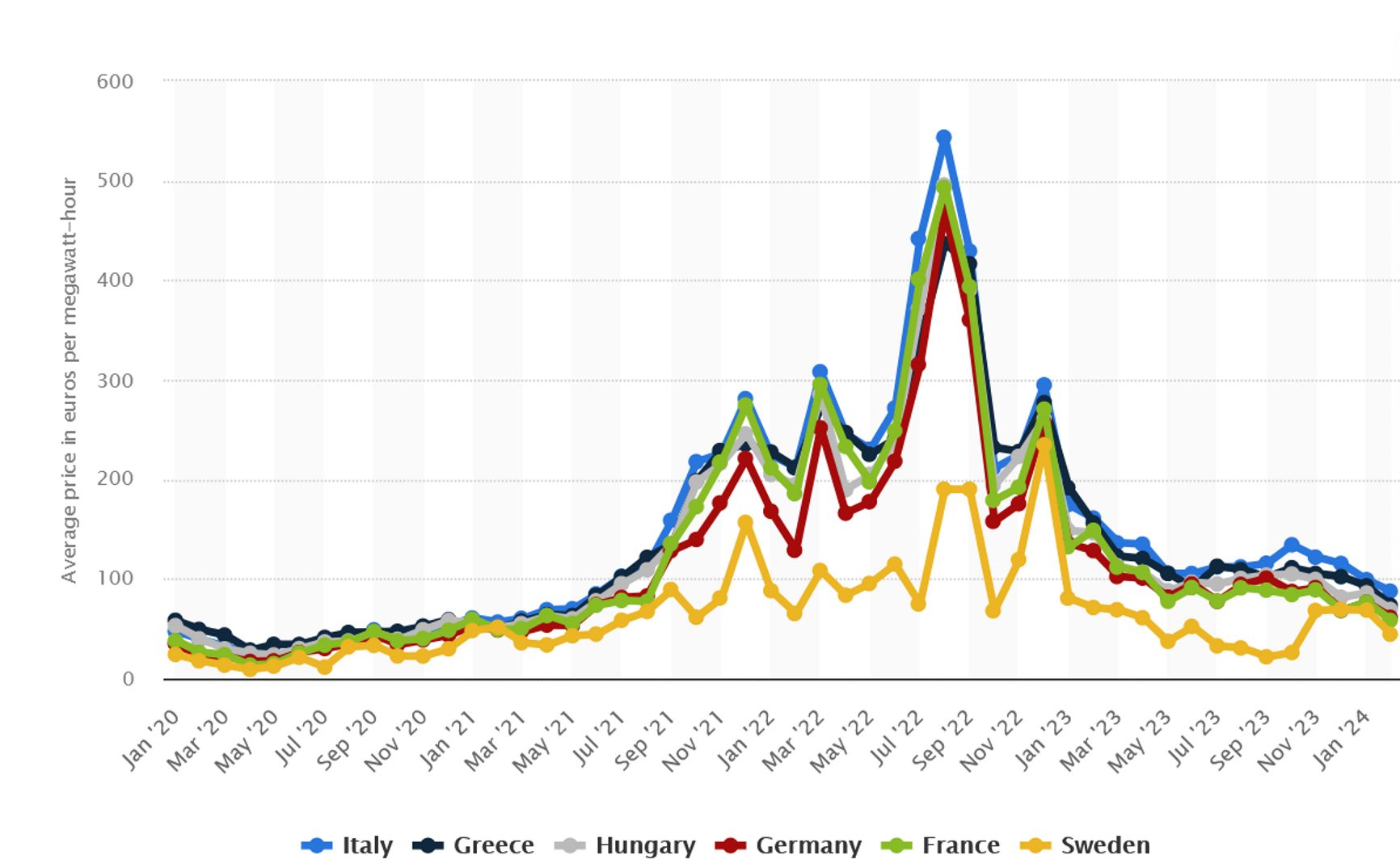 Резкое подорожание электроэнергии в странах ЕС, о котором пишет автор статьи, осталось в прошлом. Взлетевшие в середине 2022 года цены к началу 2024 года вернулись к предвоенному уровню.