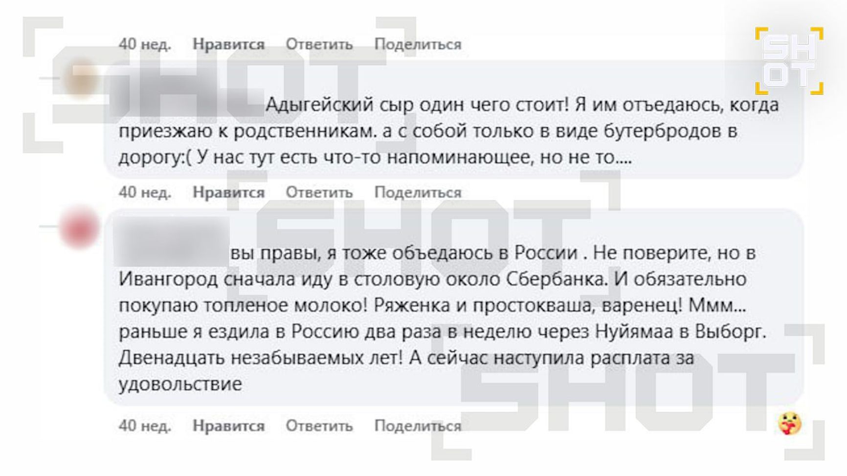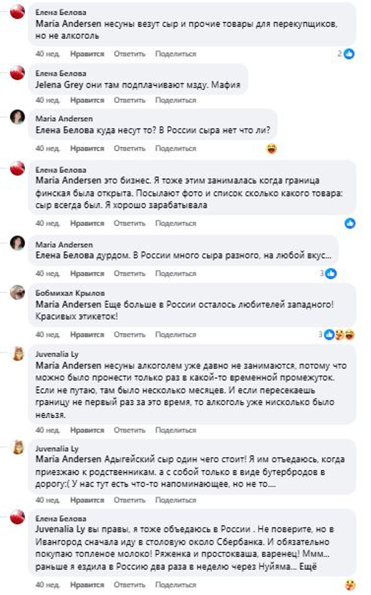 The Insider нашел эти комментарии в Facebook в группе «Граница НАРВА-ИВАНГОРОД». Оказалось, что автор комментария об айфоне покупала его в ЕС, чтобы привезти в Россию. А два комментатора, похвалившие российскую молочную продукцию, сделали это в треде, где обсуждали контрабандистов, везущих санкционные сыры из Евросоюза в РФ.