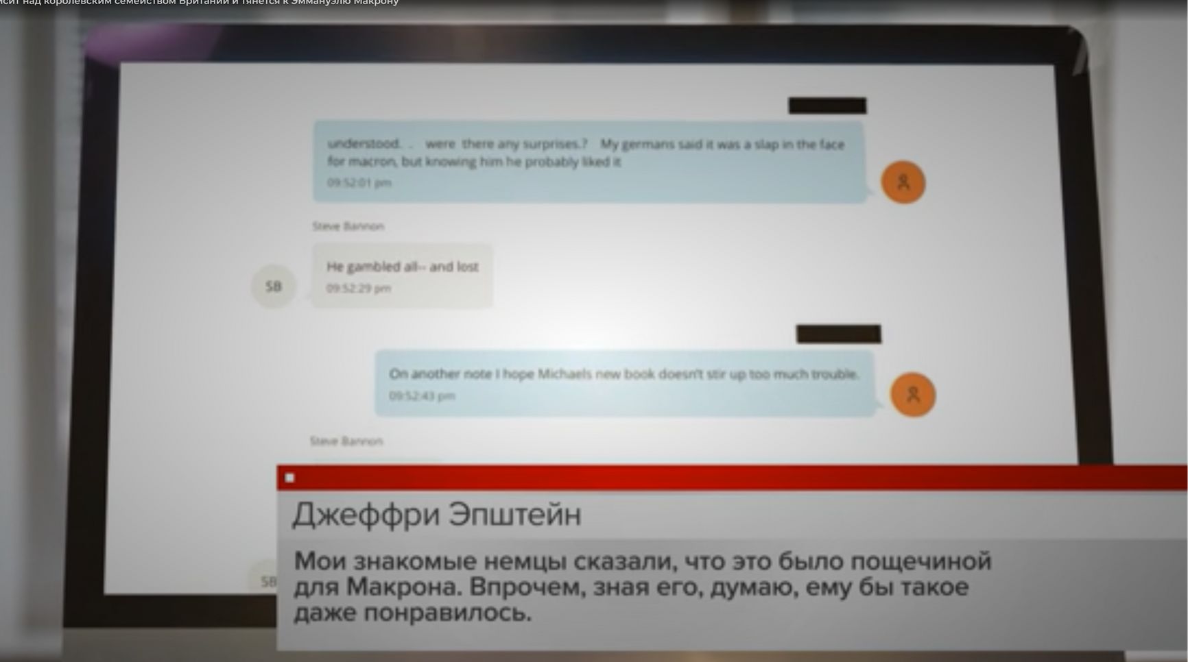 В сюжете Краснова на экране показан фрагмент переписки в мессенджере iMessage в мае 2019 года между Стивом Бэнноном, тогда старшим советником Дональда Трампа, и неким лицом, имя которого Минюст США при публикации файлов скрыл. Это может быть кто угодно, но вряд ли сам Эпштейн: прятать его имя уж точно было незачем.