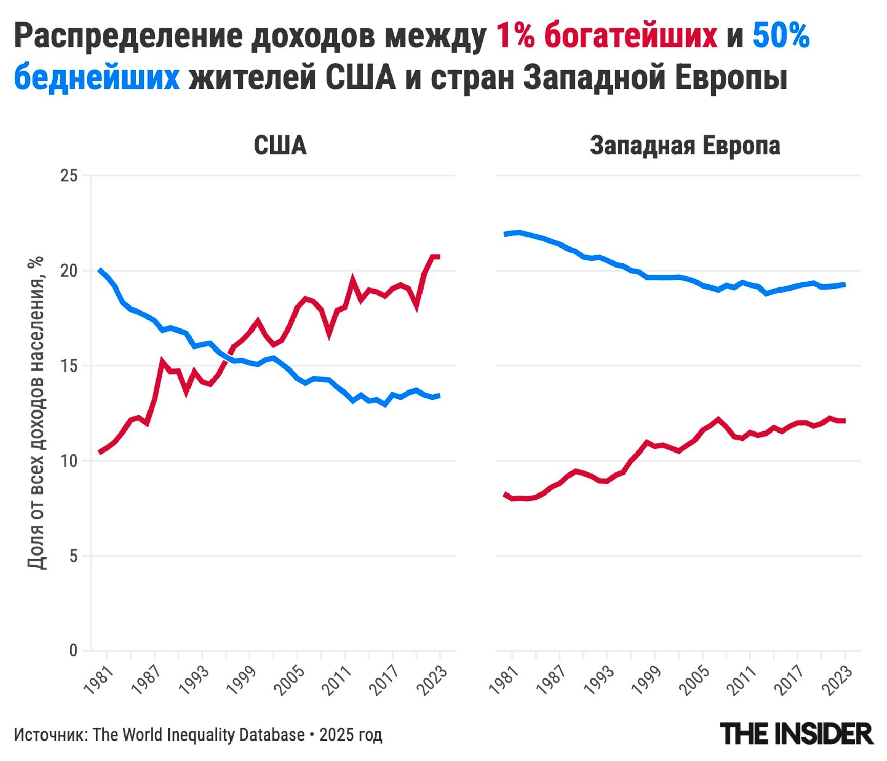 Рост неравенства наблюдается по всему миру, но не везде одинаковыми темпами. В Европе эта проблема стоит менее остро. Еще в 1980 году европейские страны демонстрировали схожие показатели с США: 1% самых богатых получали около 10% национального дохода, тогда как 50% самых бедных — около 20%. С тех пор ситуация радикально изменилась. В Европе теперь 1% богатейших людей получает 12% доходов, тогда как в США — больше 20%. А 50% беднейших в Европе получают теперь 22% национального дохода, тогда как в США — лишь 11%.