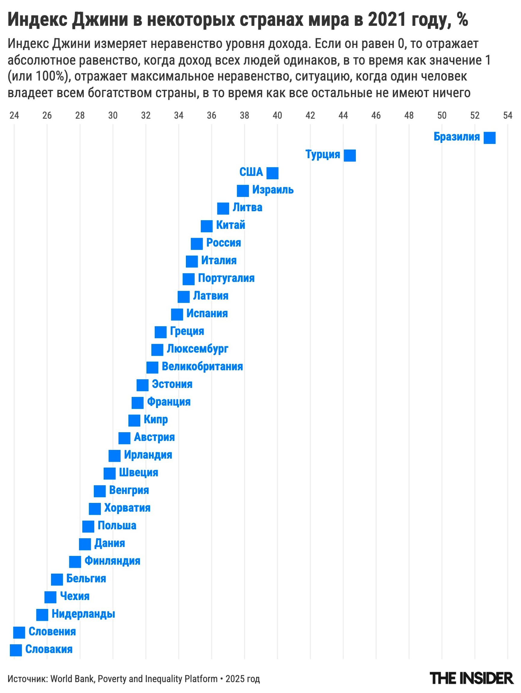 Если индекс Джини равен 0, это абсолютное равенство, если единице или 100% — максимальное неравенство, ситуация, когда один человек владеет всем богатством страны, а остальные не имеют ничего.