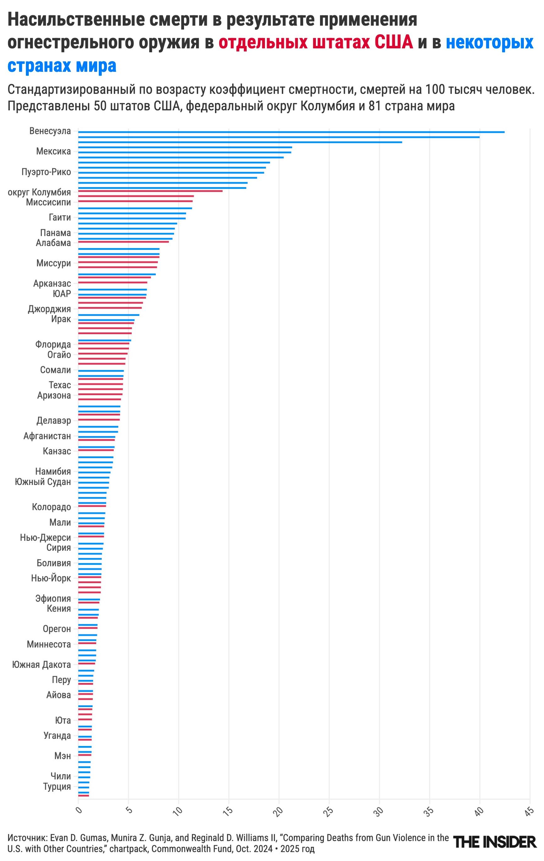 Отчасти это объясняется доступностью огнестрельного оружия: в США количество его владельцев самое высокое в мире, а возможности его приобретения регулируются гораздо менее строго, чем в большинстве других стран. Это увеличивает вероятность насильственных преступлений, таких как убийства и вооруженные нападения.