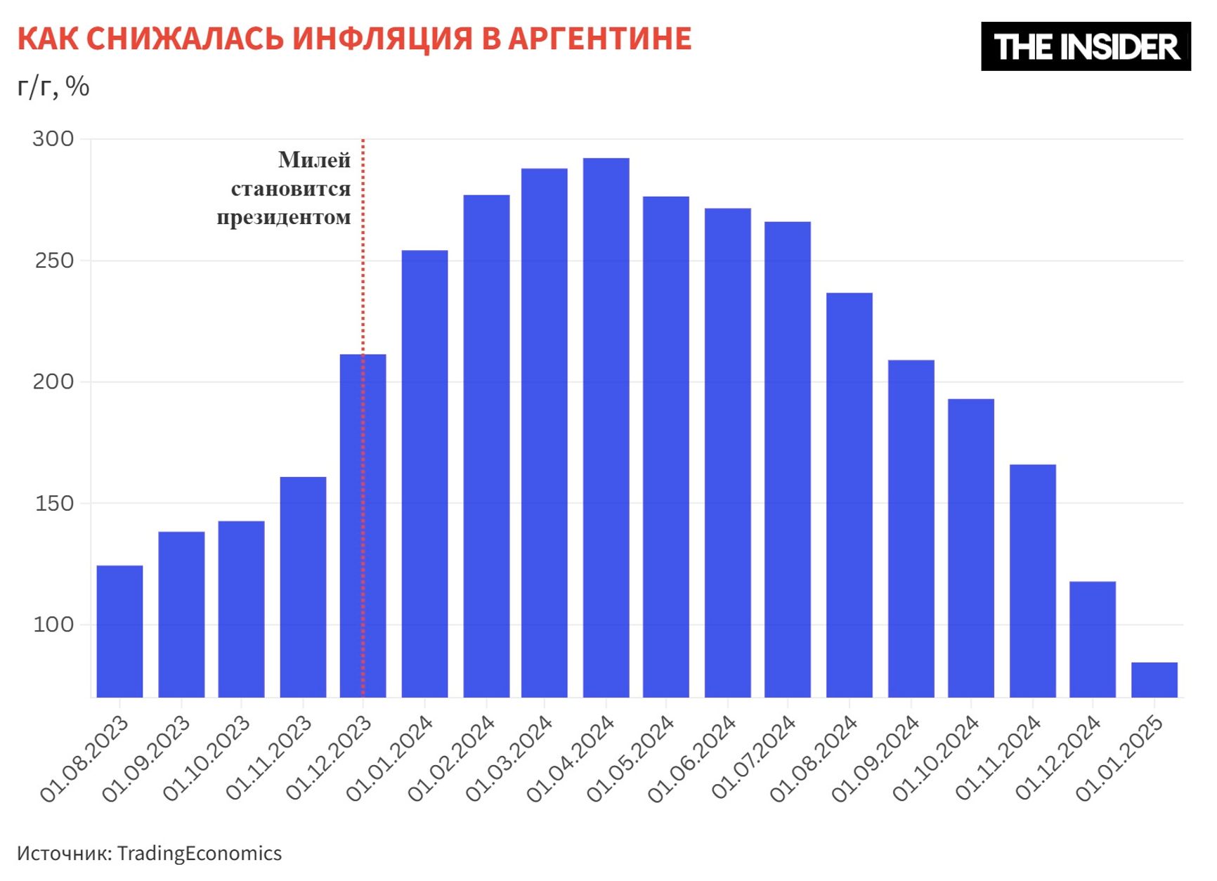 Что самое главное для аргентинцев — политика жесткой экономии Милея помогла значительно снизить уровень инфляции. В первый его год на посту президента ежемесячная инфляция снизилась в 10 раз — с 25,5% до 2,7%. Особенно хорошо видно замедление инфляции по ценам на продукты питания — тут она упала до 0,9%.