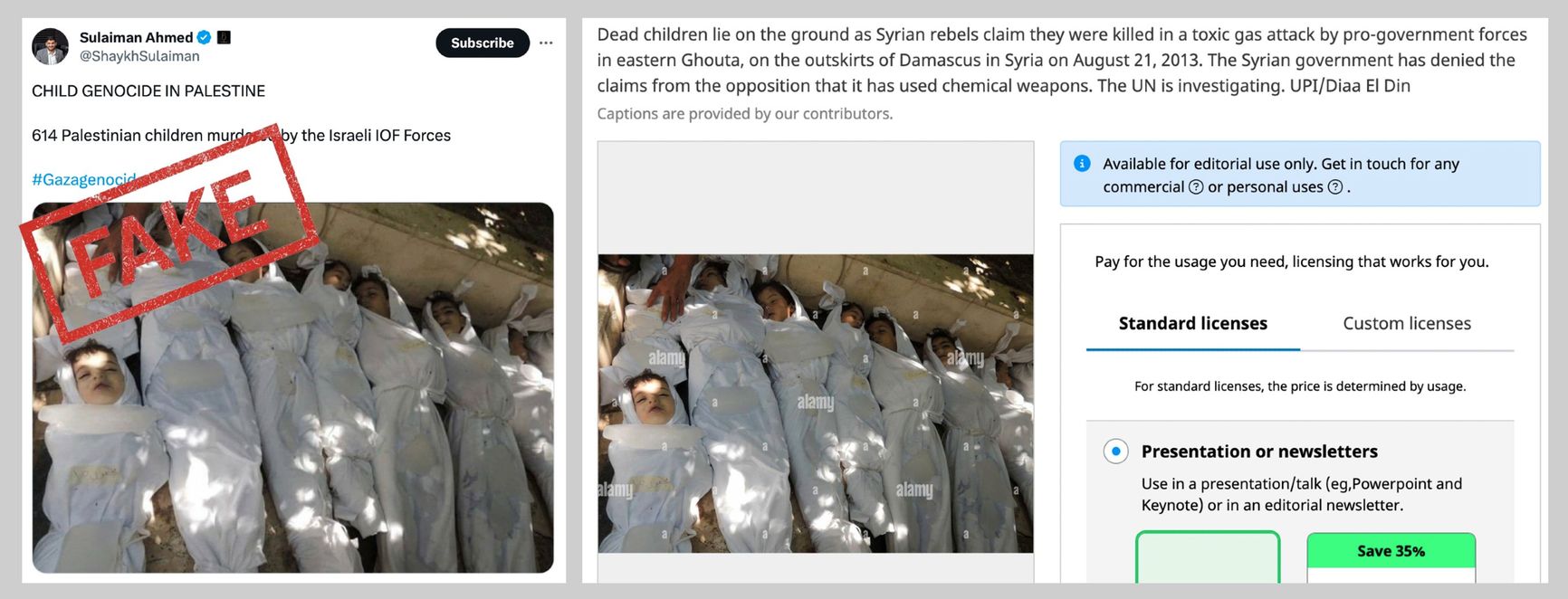 Videos from Syria have been particularly popular among anti-Israel bloggers. When Assad carpet-bombed entire cities with Putin's support, social media didn’t seem to care, but now those old Syrian videos have come in handy. For example, Sulaiman Ahmed, who calls himself an “investigative journalist” on X (Twitter), published photos of the corpses of Syrian children killed in the Ghouta chemical attack, captioning the image as follows: “Child genocide in Palestine. 614 Palestinian children have been killed by the Israeli occupation forces.” Almost 20,000 users reposted the image, including U.S. Congresswoman Ilhan Omar and American basketball player Enes Kanter Freedom. The post garnered a multi-million audience, just like many other Sulaiman Ahmed’s hoaxes.