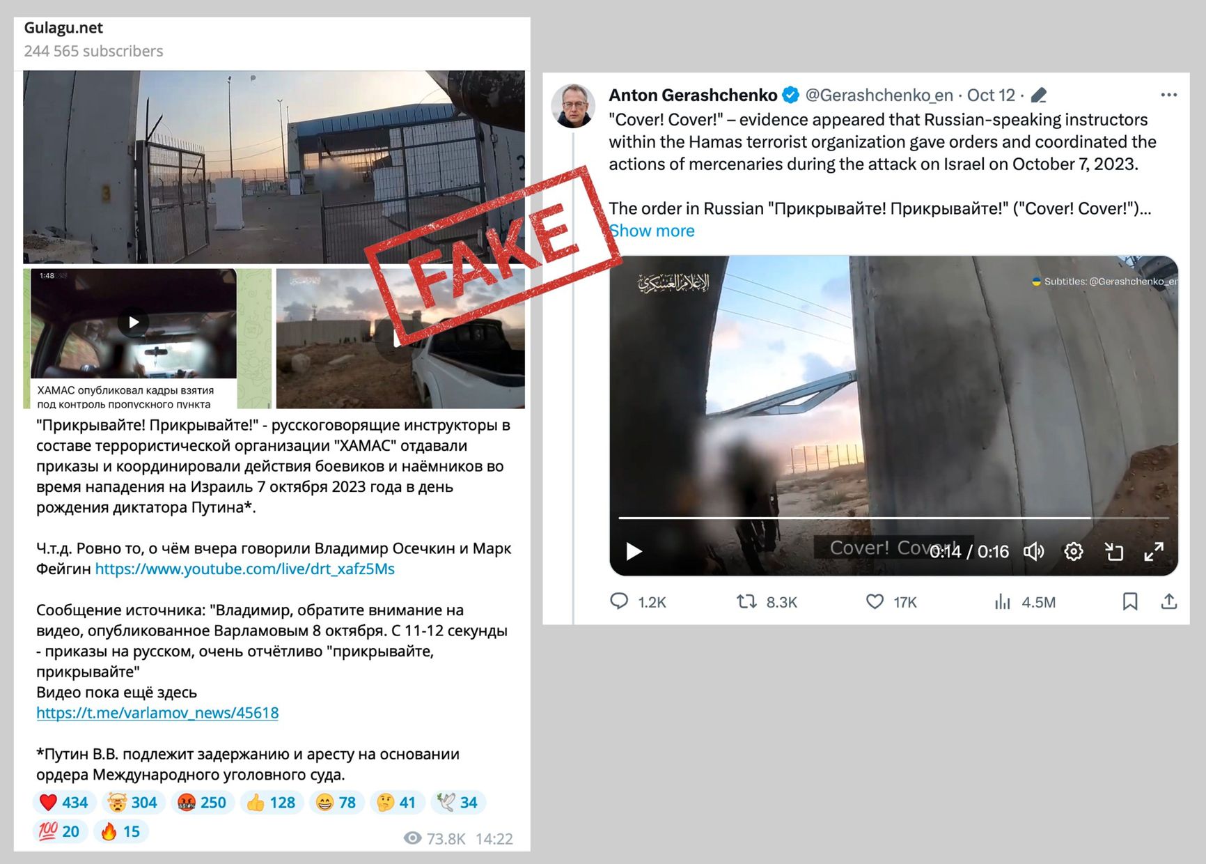 On October 12, the Al Jazeera TV channel published a series of videos from the chest DVRs of Hamas fighters. Several prominent public figures (including the advisor to Ukraine's Interior Minister Anton Gerashchenko and Gulagu.net founder Vladimir Osechkin) asserted that the militants in the video were speaking Russian. They claimed to hear them say prikryvayte (“cover!” in Russian). Osechkin saw it as validation of his theory about Hamas using instructors from Russia.