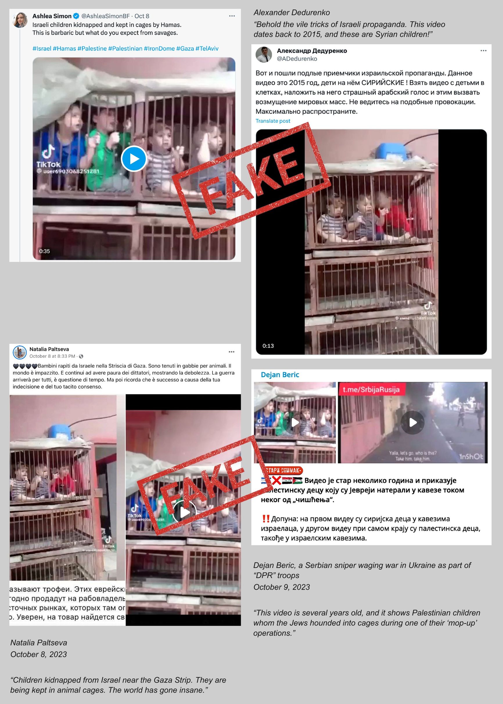 But the most infamous hoax may have been posted by Ashlea Simon, chairwoman of the far-right British party and hate group Britain First. With a limited X (Twitter) following of about 55,000 users, she managed to launch one of the most popular fakes since the war began. On October 8, she posted a TikTok video showing children locked in chicken cages. The voiceover laughs and speaks in Arabic. Ashlea accompanied the caption: “Israeli children kidnapped and kept in cages by Hamas. This is barbaric but what do you expect from savages.” On her account alone, the video has gained more than 2 million views, and other accounts that shared the video with a similar caption in different languages gathered tens of thousands of views across all platforms. Some accounts claimed those were Palestinian children kidnapped and caged by Israeli police.