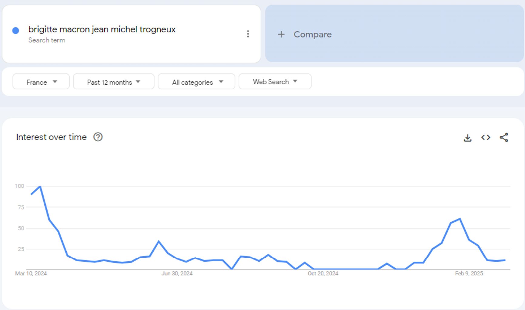 As Google Trends show, the interest in Owens's “exposés” on the part of the French public has since waned considerably. Here's how the number of searches for “jean michel trogneux” has changed over the past year.