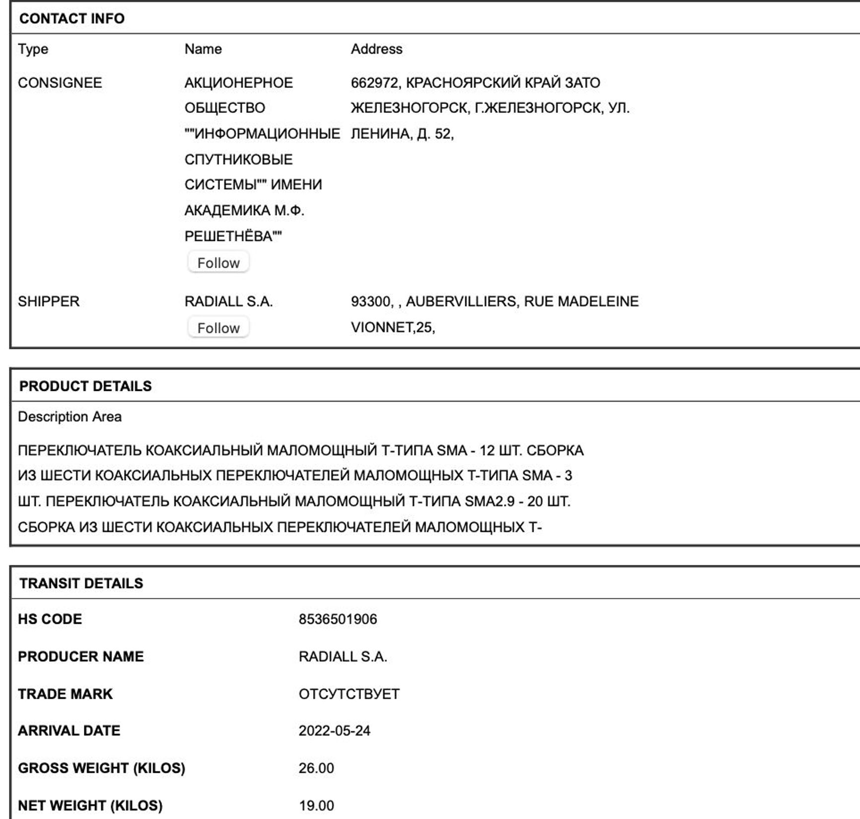The firm has only been sanctioned by the US, meaning it can freely import switches from the EU that are later used in the microchips of the rockets' onboard control systems. The switches are supplied by French company Radiall S.A.