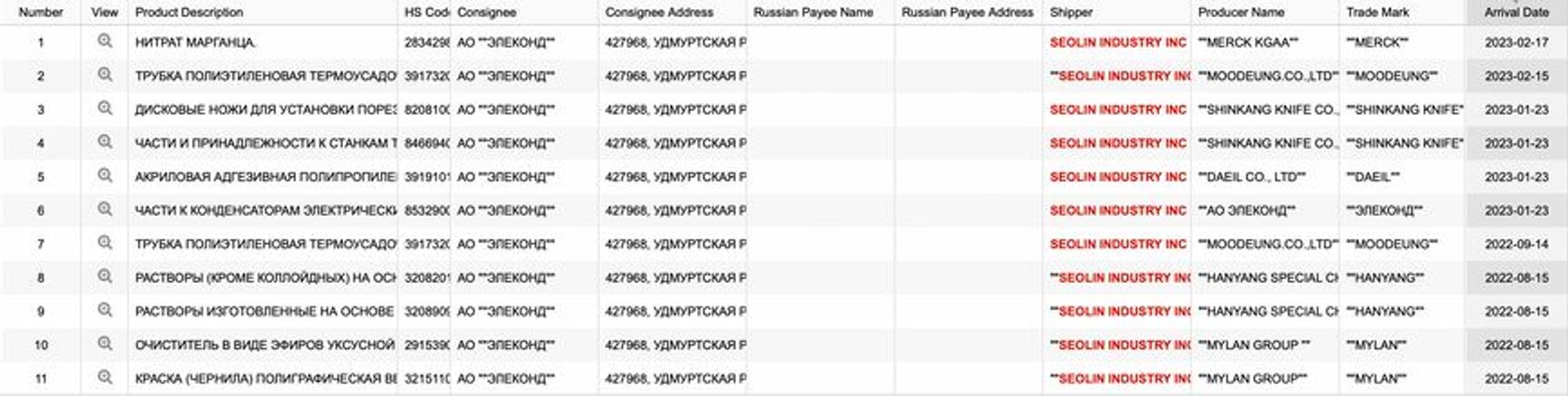 Seolin Industry Inc., also from Seoul, supplies solutions, paints and other goods to JSC Elekond in the Republic of Udmurtia — one of the Russian military-industrial complex’s leading companies in the development and production of electrolytic capacitors. It also has contracts with VOMZ.