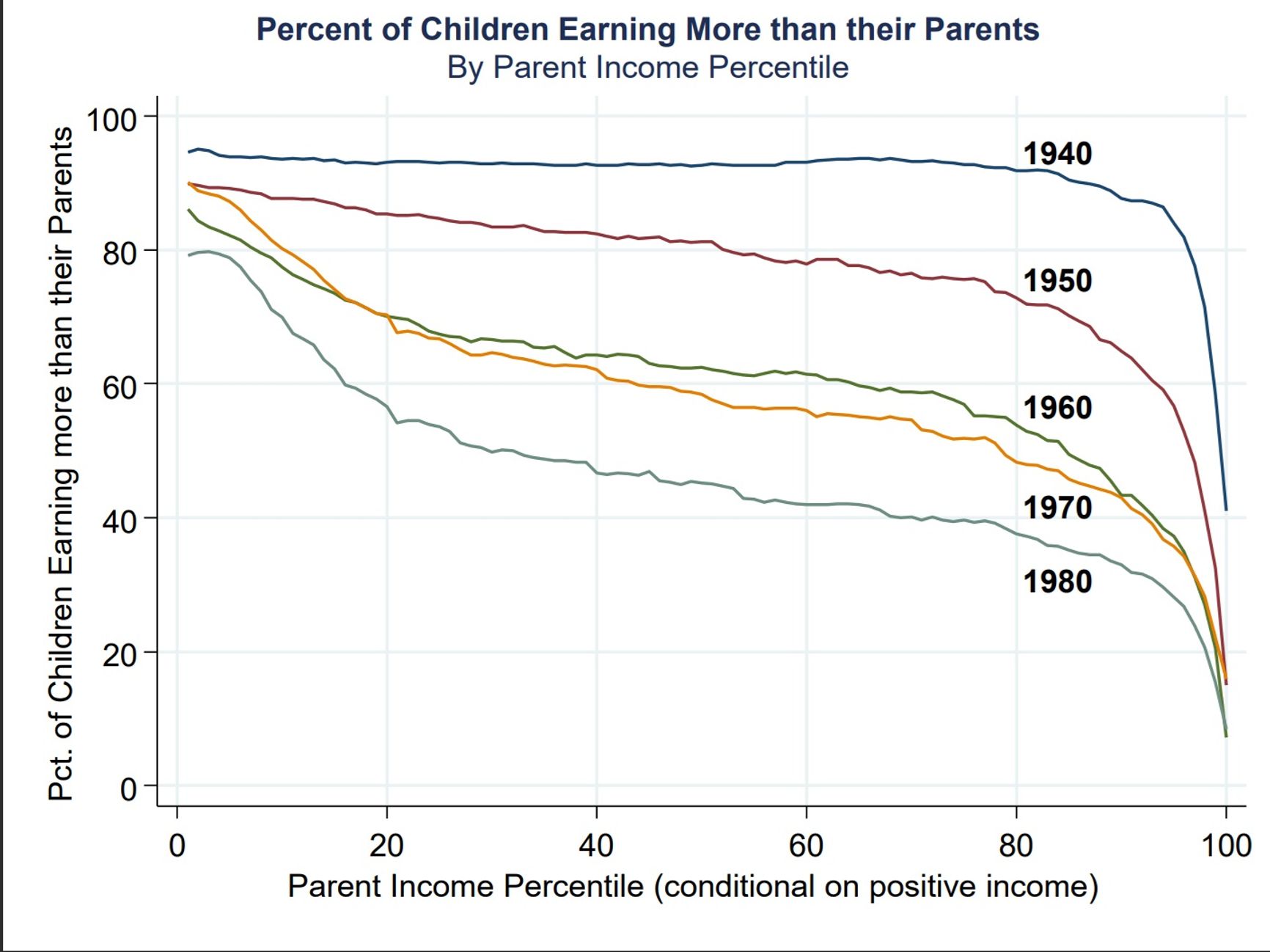 While 90% of children born in the United States in the 1940s were already earning more than their parents did at age 30, among Americans born in the mid-1980s only 50% managed to reach that threshold. If male incomes are assessed separately, the picture is even more discouraging: by age 30, fully 95% of men born in 1940 earned more than their fathers had at that age, compared with just 41% of those born in 1984.