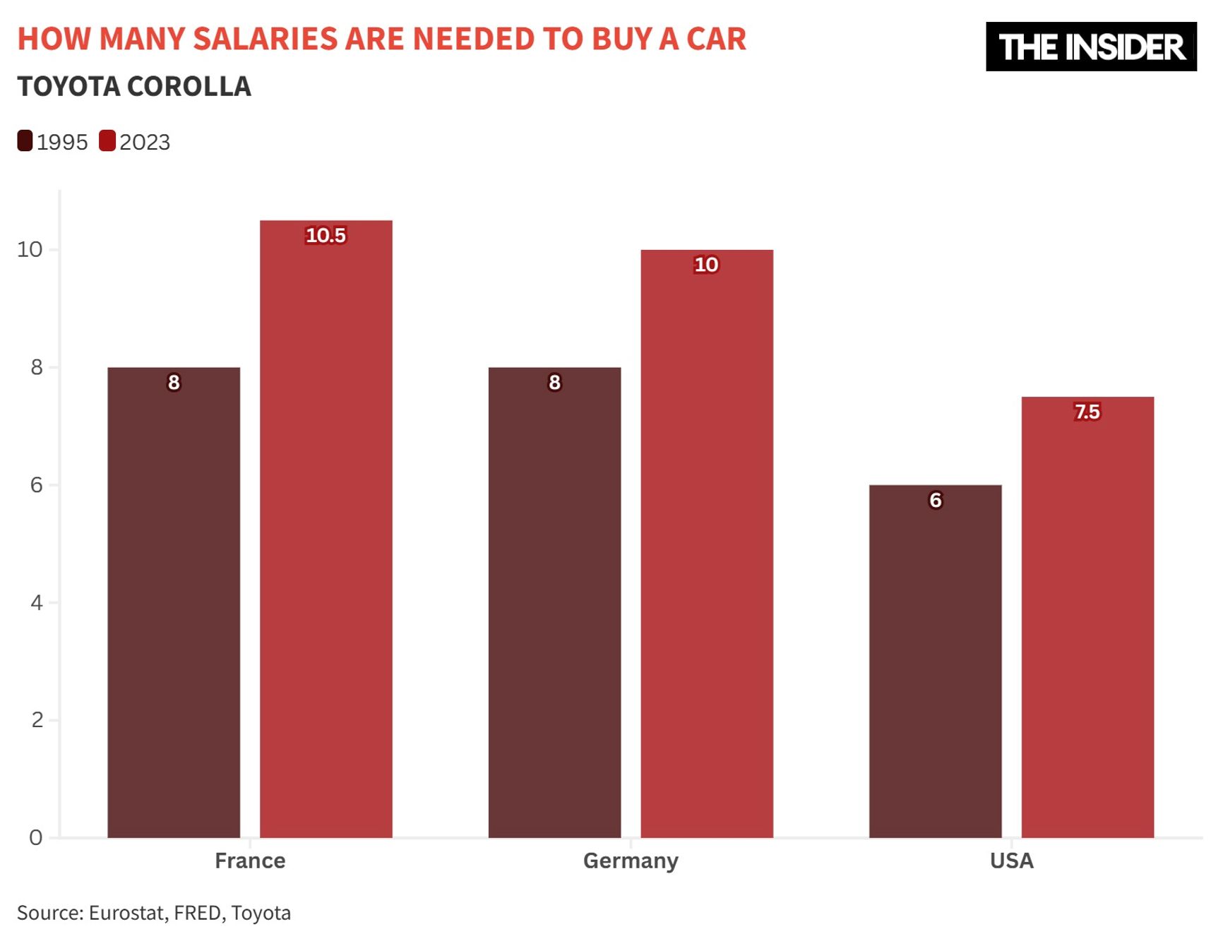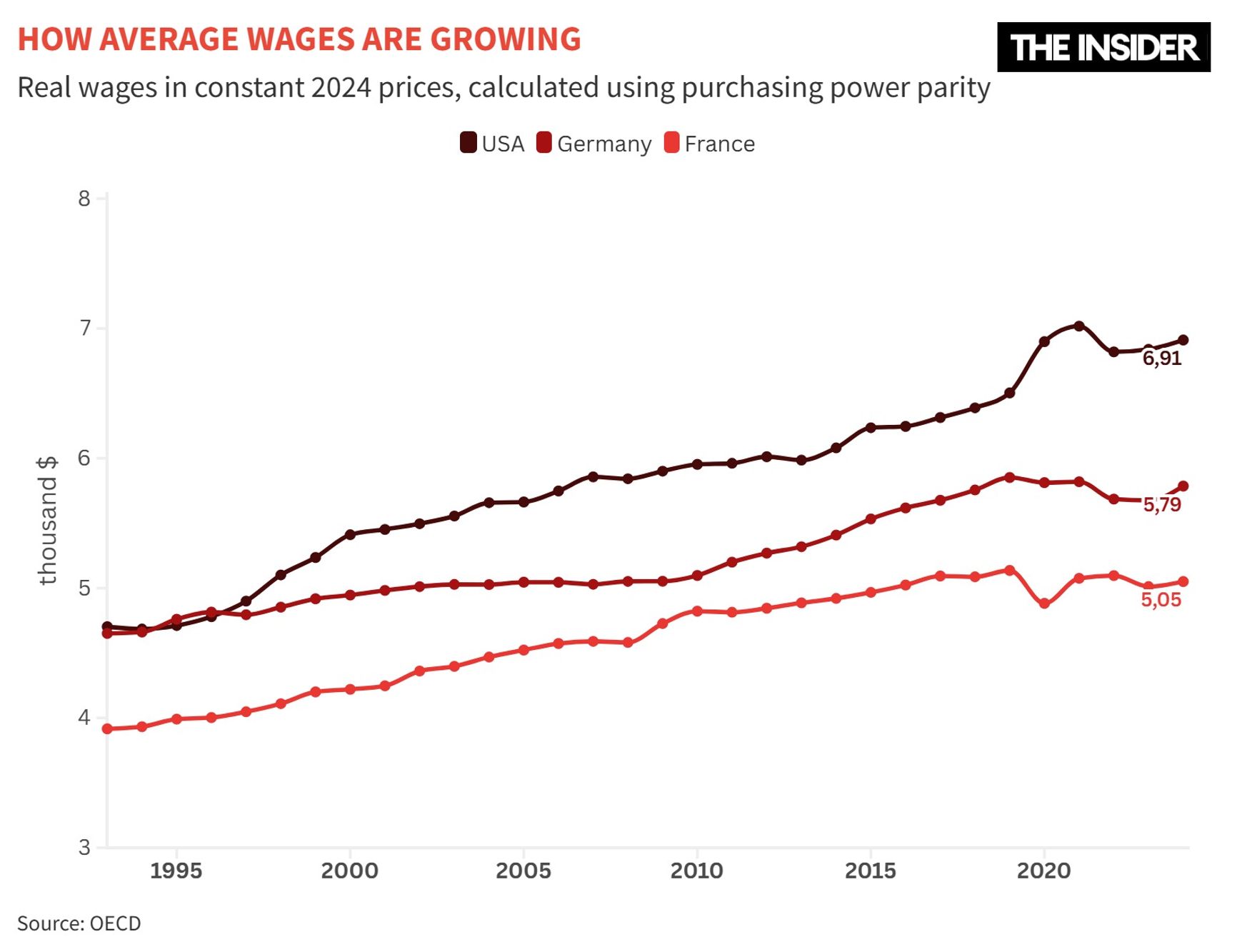Over the past 30 years, nominal wages have risen in all three countries. In America, the average annual salary was about $35,000 in 1995 and more than $81,000 in 2023 – an increase of roughly 130%. In France over the same period, the average nominal salary rose from €25,000 to €43,500 per year – up 57%. In Germany, it increased from €42,000 to €48,300 — about 15%. In terms of real growth, the United States also led: over the past 30 years, wages there have risen by 10–15%, compared with 5–10% in Germany and France.