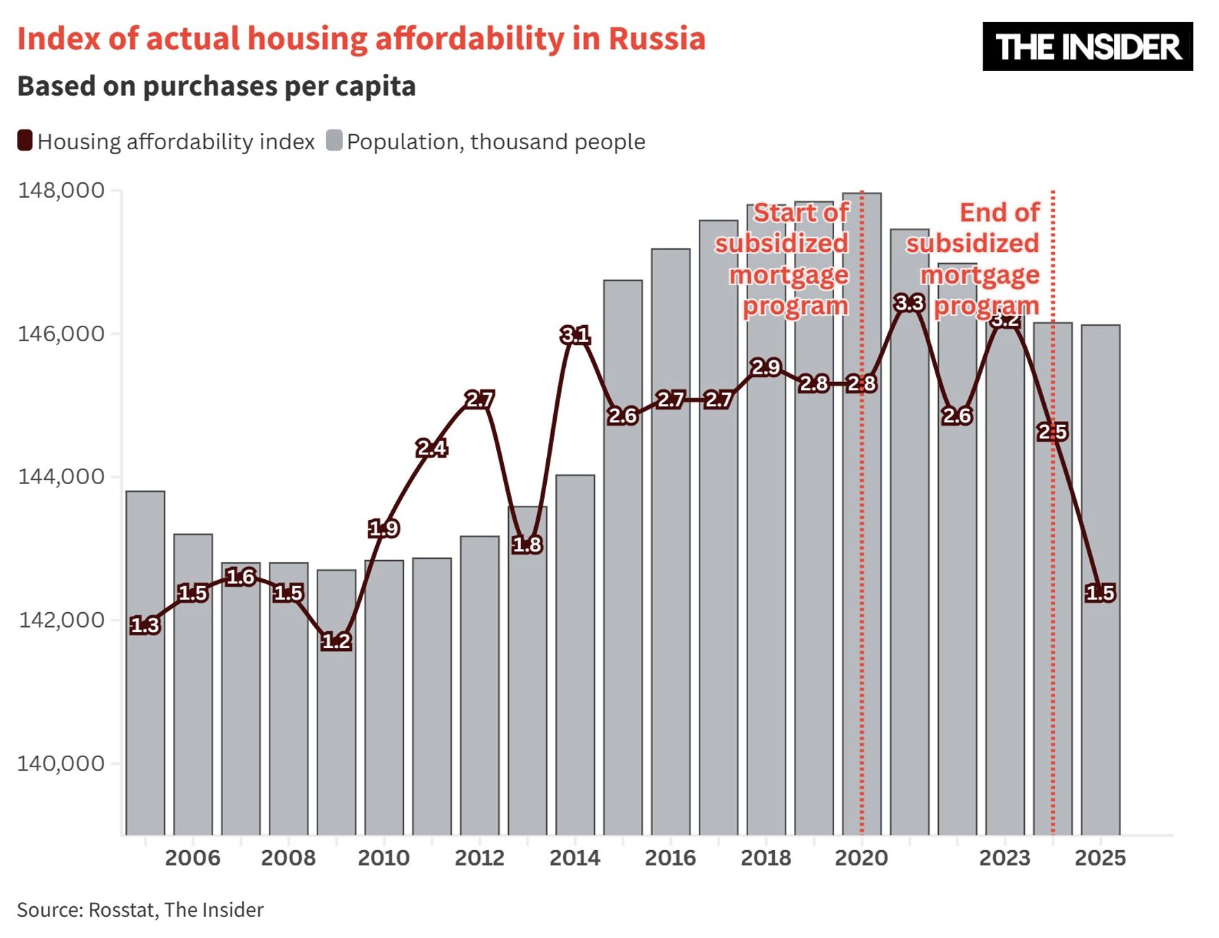 A similar dynamic can be observed in housing. Real estate prices, which seemed to fluctuate dramatically, in fact largely mirrored wage levels, meaning that little changed for Russians when it came to long-term affordability. In 2005, one square meter in Moscow cost the equivalent of 11 monthly salaries. Affordability then declined for several years before returning to that level in the early 2010s, remaining there until the start of the full-scale war — after which it actually improved slightly.
