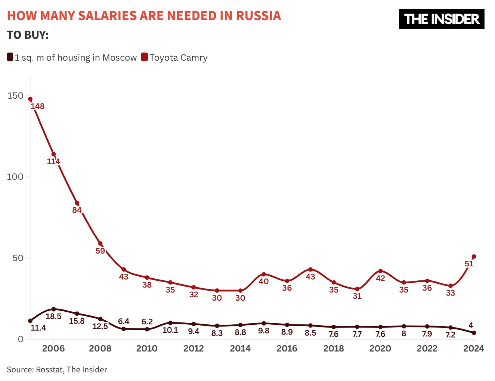 If we look at the affordability of specific goods and services, life for Russian citizens improved far more significantly in the early 2000s than it did for populations in Western countries. This was not only due to the rise in oil prices but also to the effect of a low starting point: both arithmetically and psychologically, growth from near-zero levels appears much more substantial than growth from already high indicators. However, since the late 2000s, the impact of that growth has largely faded. As an example, consider the Toyota Camry: in 2005, purchasing such a car cost Russians 150 average monthly salaries; by 2010, that figure had fallen to just 38 and hovered around that level for more than a decade; then the full-scale invasion saw it jump to 51.