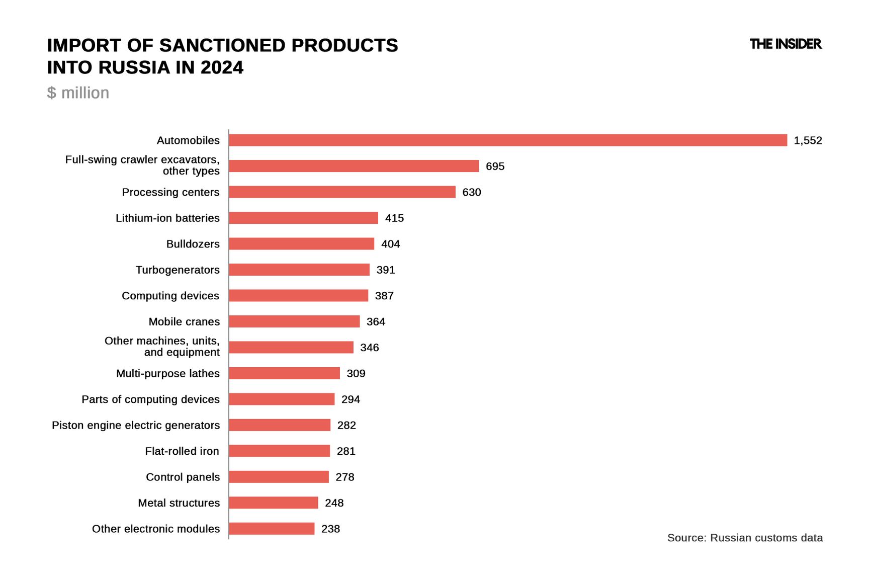 These goods are used in both civilian and military applications. At the same time, as The Insider has reported, under current conditions even seemingly civilian goods end up being used to further the work of Russia’s military-industrial complex. For example, “lithium-ion batteries” are a key military item, as batteries are primarily needed for drones. As The Insider has been reporting for years, complex foreign goods such as machining centers and lathes are likewise in demand first and foremost from Russian military-industrial enterprises.