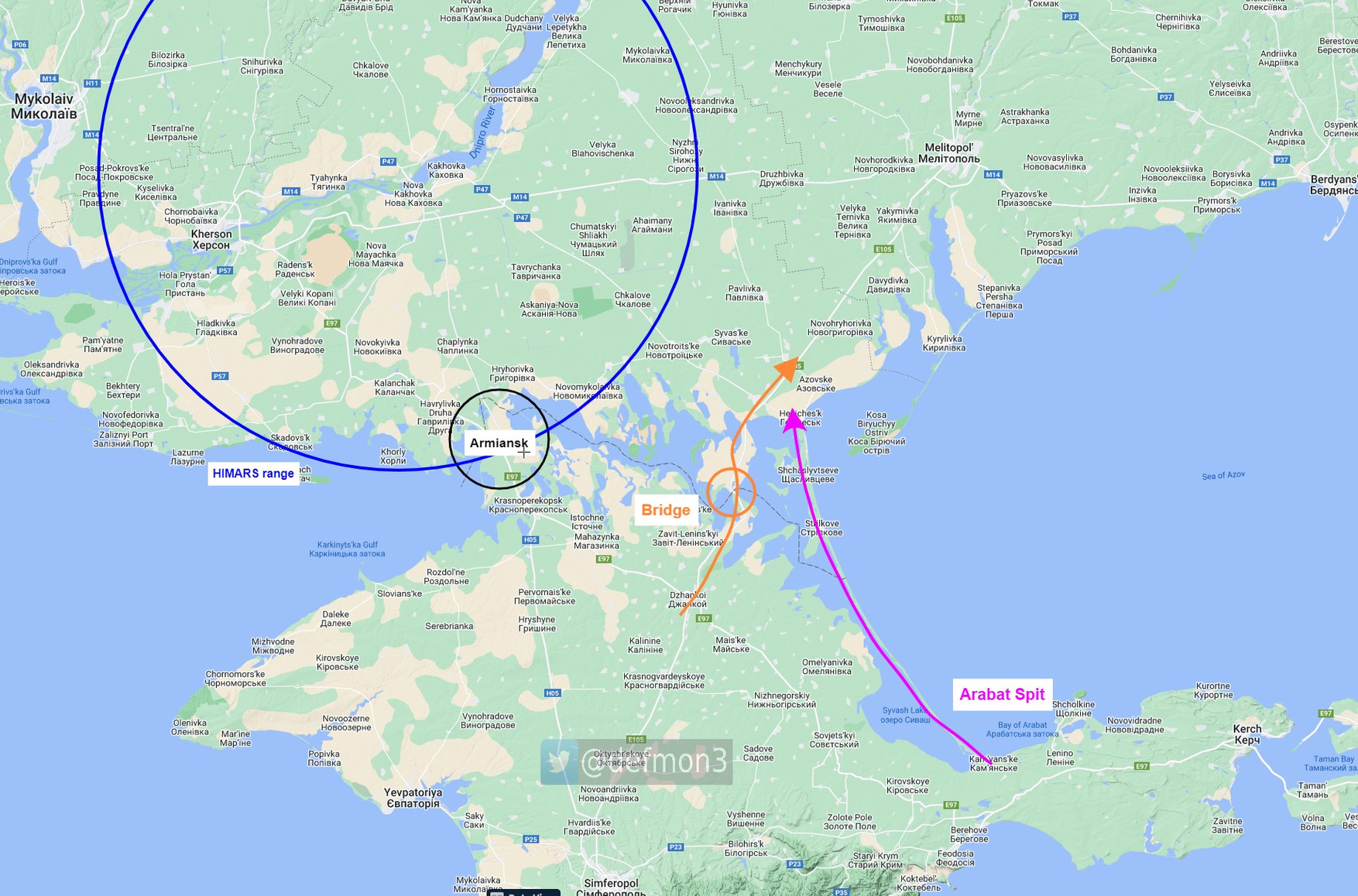 OSINT analyst DefMon also believes that the main road from Crimea is now under effective control of the HIMARS launcher. According to him, the road through the Arabat Spit is clearly not suitable for heavy traffic now. The only road suitable for the transfer of equipment lies across the Crimean bridge.