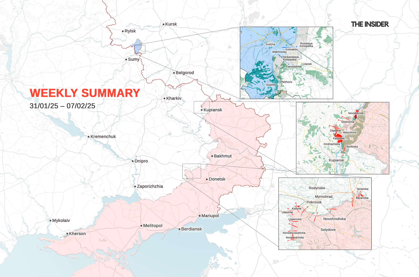 For most of the week, the front in the Kursk Region remained relatively stable, with only minor Russian assaults repelled near Makhnovka, south of Sudzha. However, on Feb. 6, Ukrainian forces — estimated at up to two battalions — launched a new offensive from Makhnovka, likely aiming to push Russian troops further from Sudzha. In some areas, Russian positions were as close as 3 km to the district center. Ukrainian forces advanced up to 5 km, operating within a 15-square-kilometer zone where their equipment has been spotted. Reports indicate that the AFU suffered significant equipment losses due to strikes from Russian FPV drones using fiber-optic guidance, though estimates vary, with claims ranging from “all combat vehicles destroyed” to “around five losses.”
