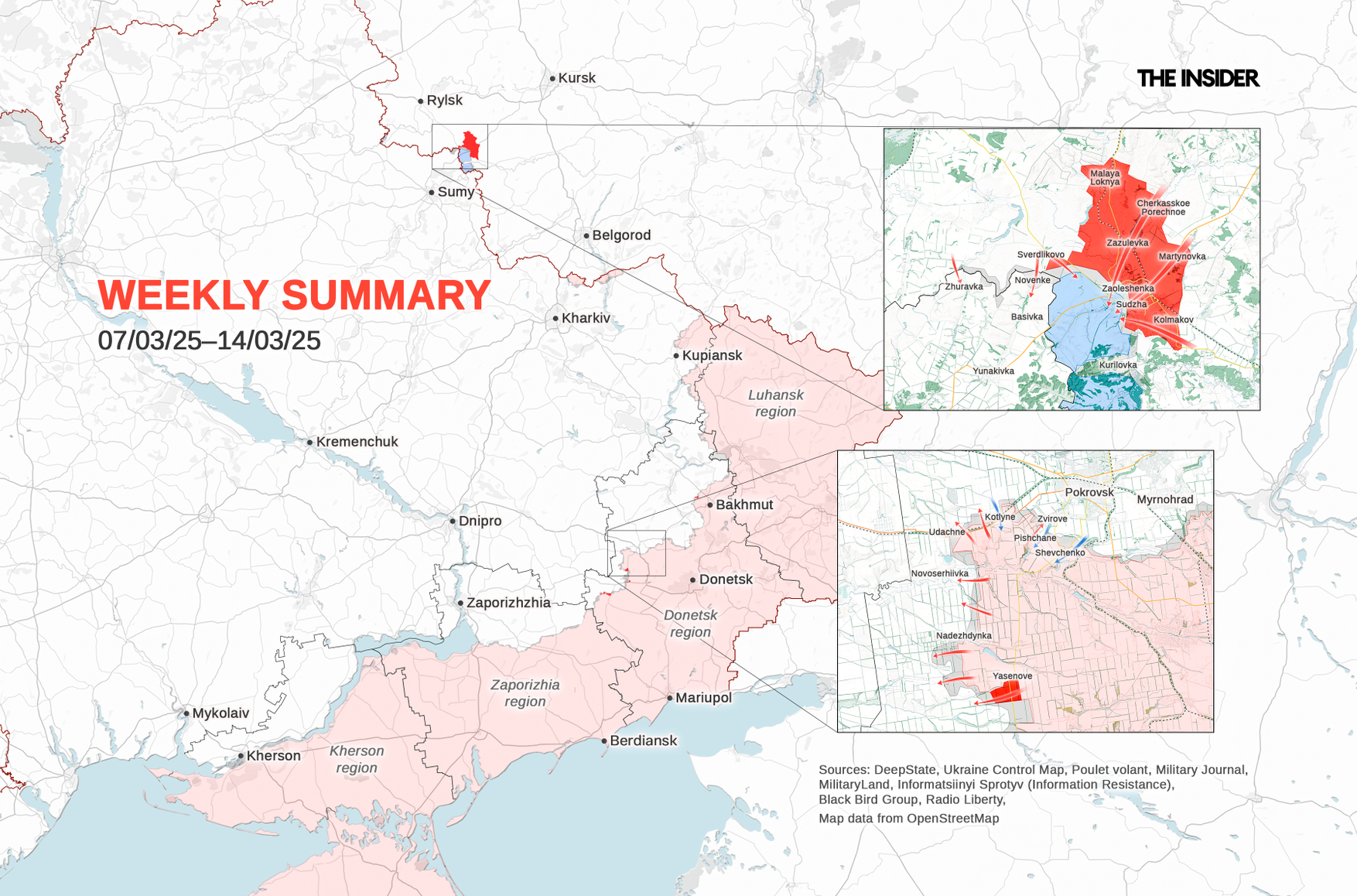 The Russian Ministry of Defense reported on the liberation of Sudzha on March 13, and Vladimir Putin arrived in military uniform at a command post in the Kursk Region to hear a report from Chief of the General Staff Valery Gerasimov, who said that the AFU grouping in the region was “isolated” and was undergoing “consistent destruction.” Apparently, Putin shared this information with Donald Trump's envoy Steve Whitkoff during his visit to Moscow, as Trump later publicly asked Putin to spare the lives of Ukrainian soldiers allegedly trapped in an encirclement, while Putin urged the Ukrainian commanders to order their troops to lay down their arms and surrender. The AFU General Staff responded with public assurances that there was no encirclement in the Kursk Region. The claims of Putin and Trump were also debunked by several Western analysts (1, 2, 3).