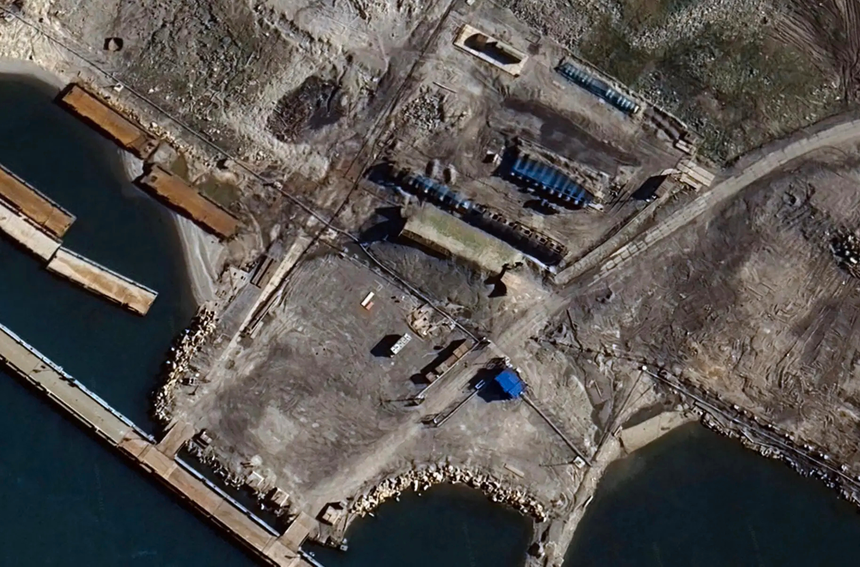 Blue-tinted metal nets, known as “cope cages,” cover three rows of fuel storage tanks near the Russian port facility in Severny on the Novaya Zemlya archipelago. Source: Google Earth / The Barents Observer