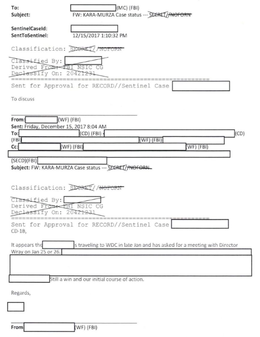Why the sudden secrecy? Perhaps a clue can be found in the few dozen pages of the published case materials. One of the declassified documents states that in late January 2018, some person (name redacted from the document) who had requested a meeting with FBI Director Christopher Wray was to fly to Washington, D.C. It is known that between January 21 and 27, 2018, three key Russian security officials flew to the U.S. - the head of the FSB Alexander Bortnikov, the head of the SVR Sergey Naryshkin and the head of the GRU Igor Korobov. Of the three, Bortnikov is the one who best fits the status of a person who could ask for a meeting with the head of the FBI. The very fact that this meeting is mentioned in the documents within the Kara-Murza case file indicates that his case was discussed at the meeting. If it’s true, the refusal to publish the test results could be part of a deal.