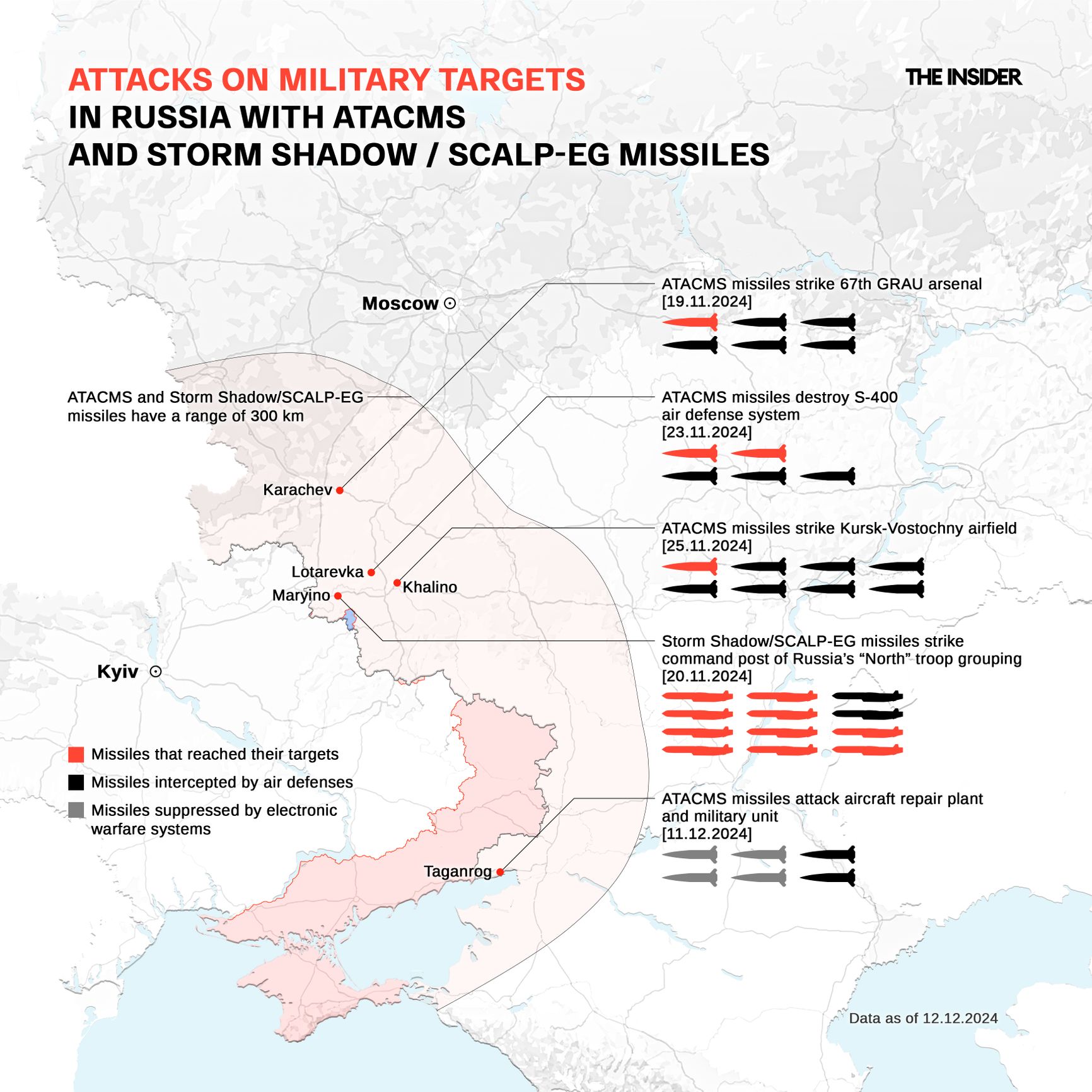- Nov. 23 — ATACMS targeted an S-400 air defense system position in the Kursk Region. Reports indicated the destruction of two launchers, a radar station, and the deaths of five Russian servicemen and three civilian specialists from the Almaz-Antey defense corporation (as the S-400 system was under repair).