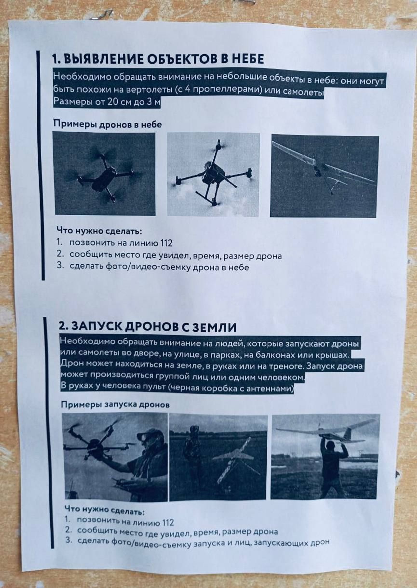 Another anti-drone measure that the Moscow authorities adopted immediately after the attack on the Kremlin was the posting of signs banning drones across the city. Warnings about the inadmissibility of using drones printed on an A4 sheet of paper were hastily posted all over Moscow – on porches, poles, trash bins, parks, and playgrounds. The black and white printouts showed what drones look like, and urged people to report sightings of drones or their operators to the police.