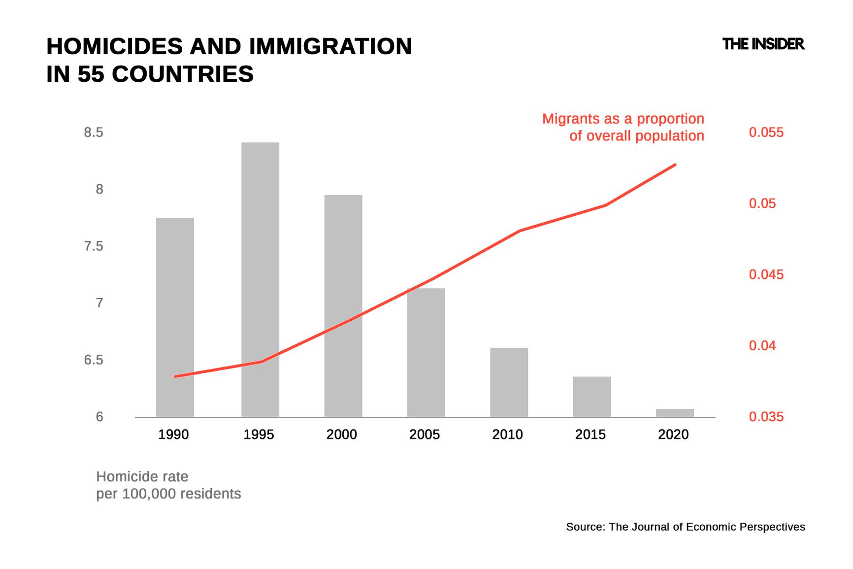 Studies of the correlation between migration and crime have been conducted for over a century and have consistently shown that the relationship is either non-existent, or else it works in the opposite direction. In simple terms, crime rates go down in places where there are many foreigners in a society. A comparison of homicide and immigration rates for 55 countries between 1990 and 2019 also shows a consistent decline in the number of crimes per capita.