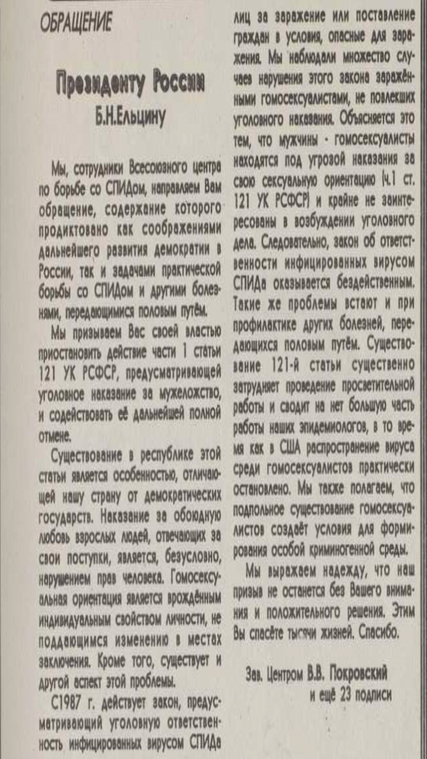 «Мы, сотрудники Всесоюзного центра по борьбе со СПИДом, направляем Вам обращение, содержание которого продиктовано как соображениями дальнейшего развития демократии в России, так и задачами практической борьбы со СПИДом… Мы призываем Вас своей властью приостановить действие части первой статьи 121 УК РСФСР, предусматривающей уголовное наказание за мужеложство, и содействовать ее дальнейшей полной отмене…