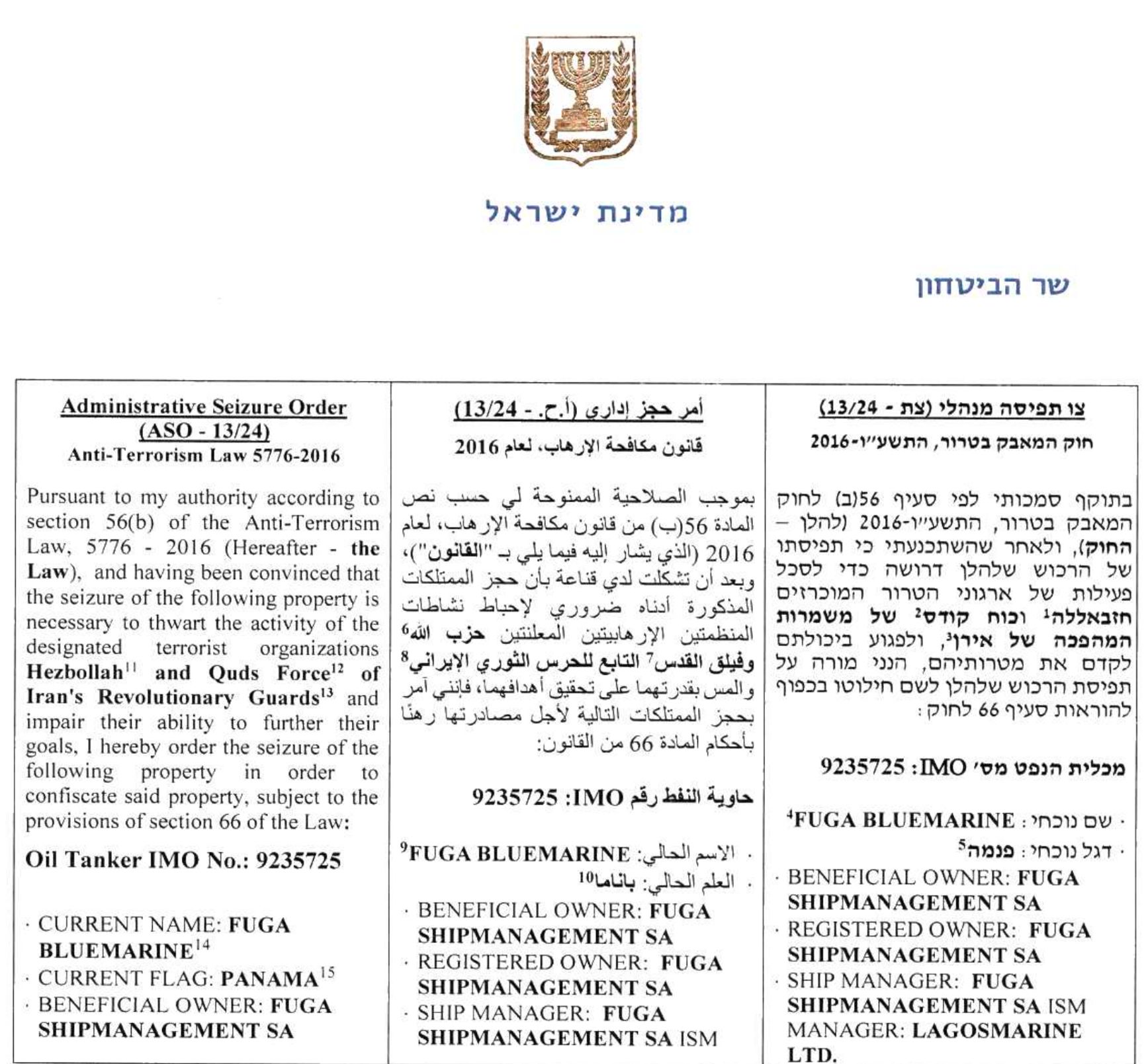 Любопытно, что Израиль обвиняет один из танкеров Lagosmarine, а именно Fuga Bluemarine, в перевозке иранской нефти в интересах «Сил Кудс» (Quds Force) и «Хезболлы». Это следует из документа за подписью министра обороны Израиля Йоава Галанта.