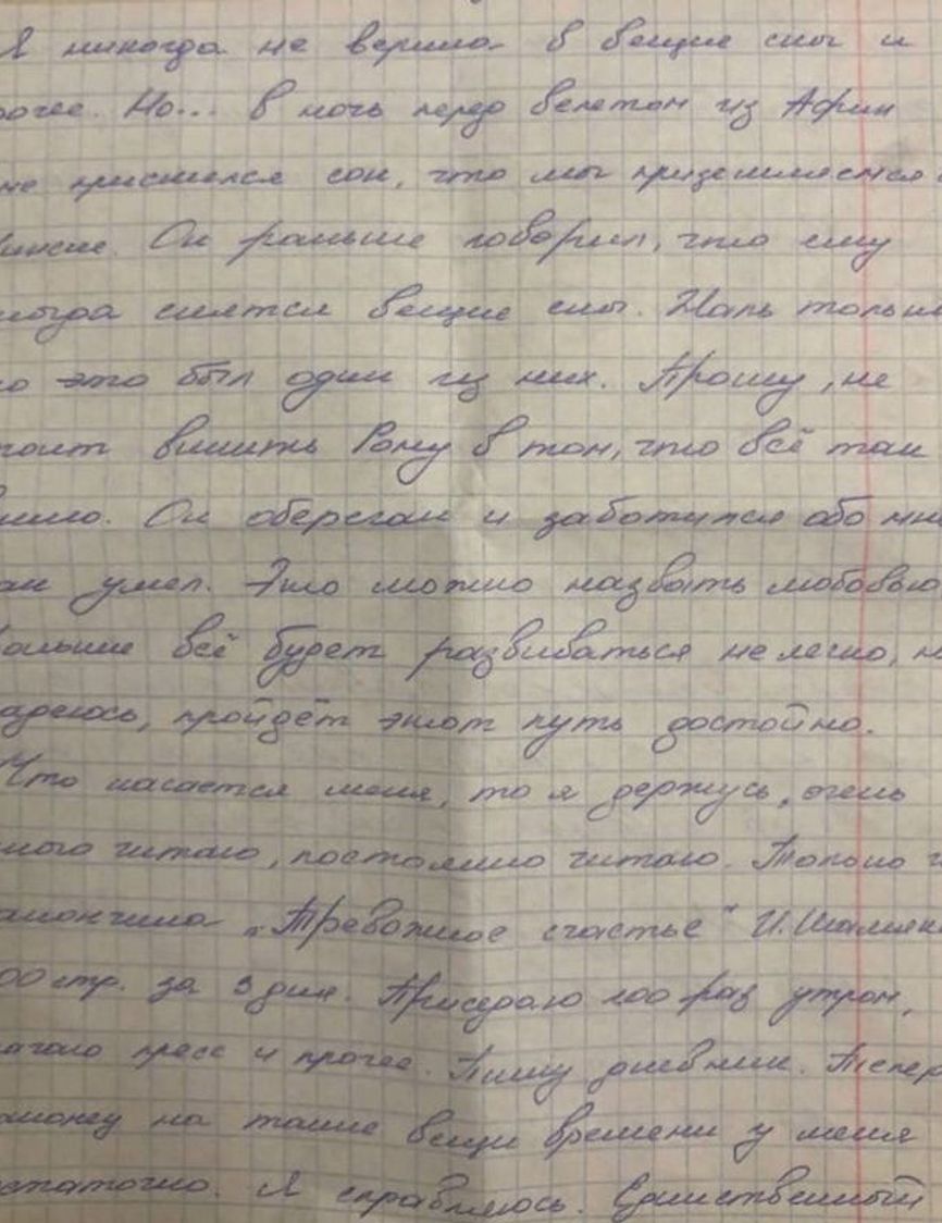 «Я кушаю, хорошо кушаю, честно! Ваши сладости и прочее улетают достаточно быстро :) Да, здесь есть врач и он регулярно меня посещает. Приятный человек. Выписал мне успокоительное и колет глюкозу для аппетита. Он просит называть это сывороткой правды :) Не передать, как приятно, что тебе звонят и пишут друзья из университета. Правда - очень. Передайте им, пожалуйста, большой привет, скажите, что я очень это ценю. Я горжусь, что у меня есть такие люди, как они! Передайте им это!»