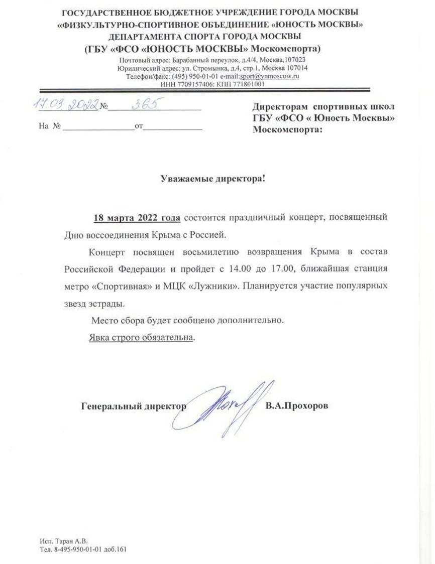 18 марта в России пройдут патриотические акции по случаю годовщины аннексии Крыма и в поддержку войны в Украине. Центральным событием станет концерт в Лужниках с участием эстрадных артистов. Об этом сообщает Telegram-канал «Можем объяснить», который публикует скриншоты сообщений от руководства государственных предприятий, школ и других бюджетных учреждений, присланные читателями канала.