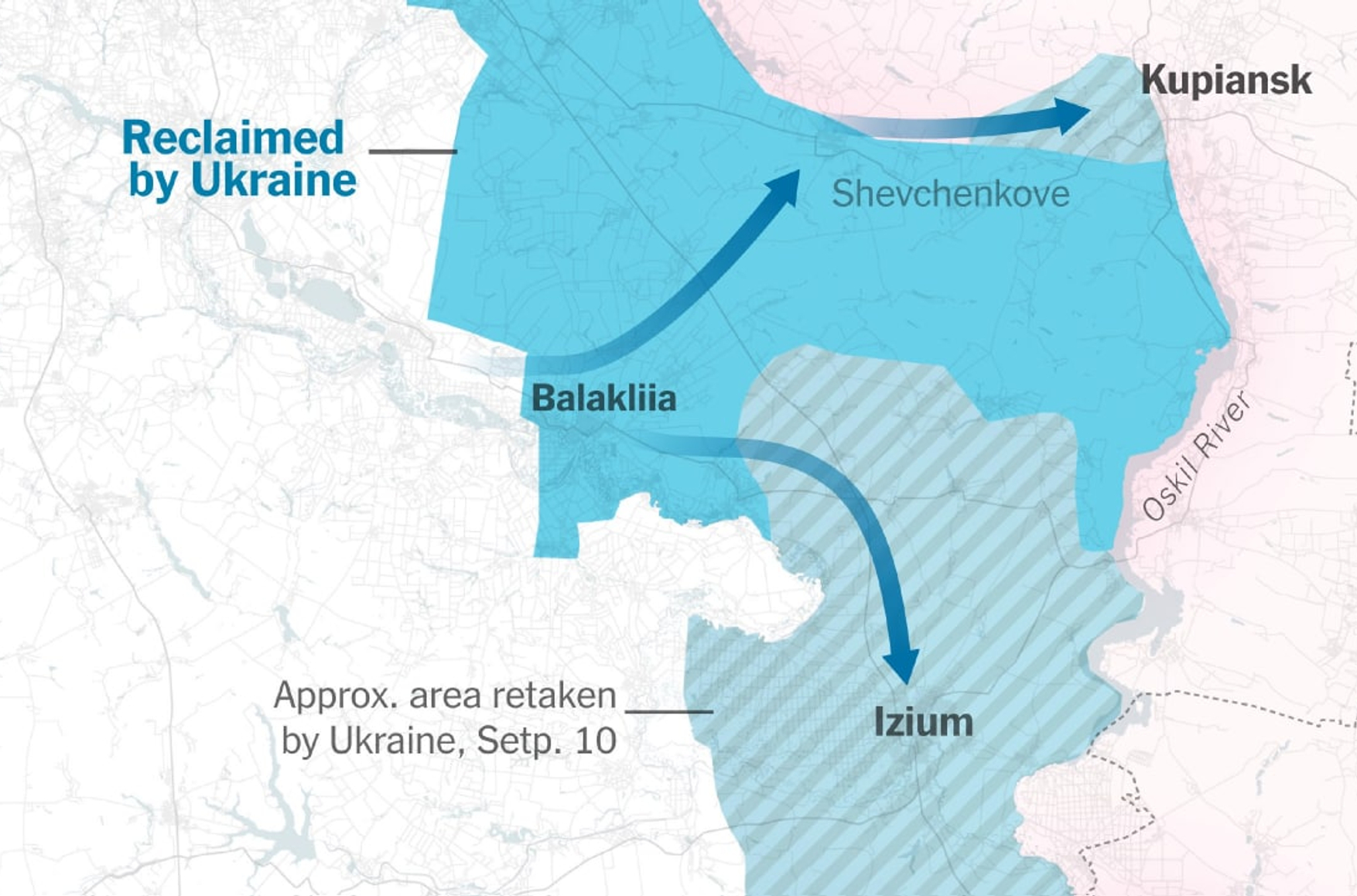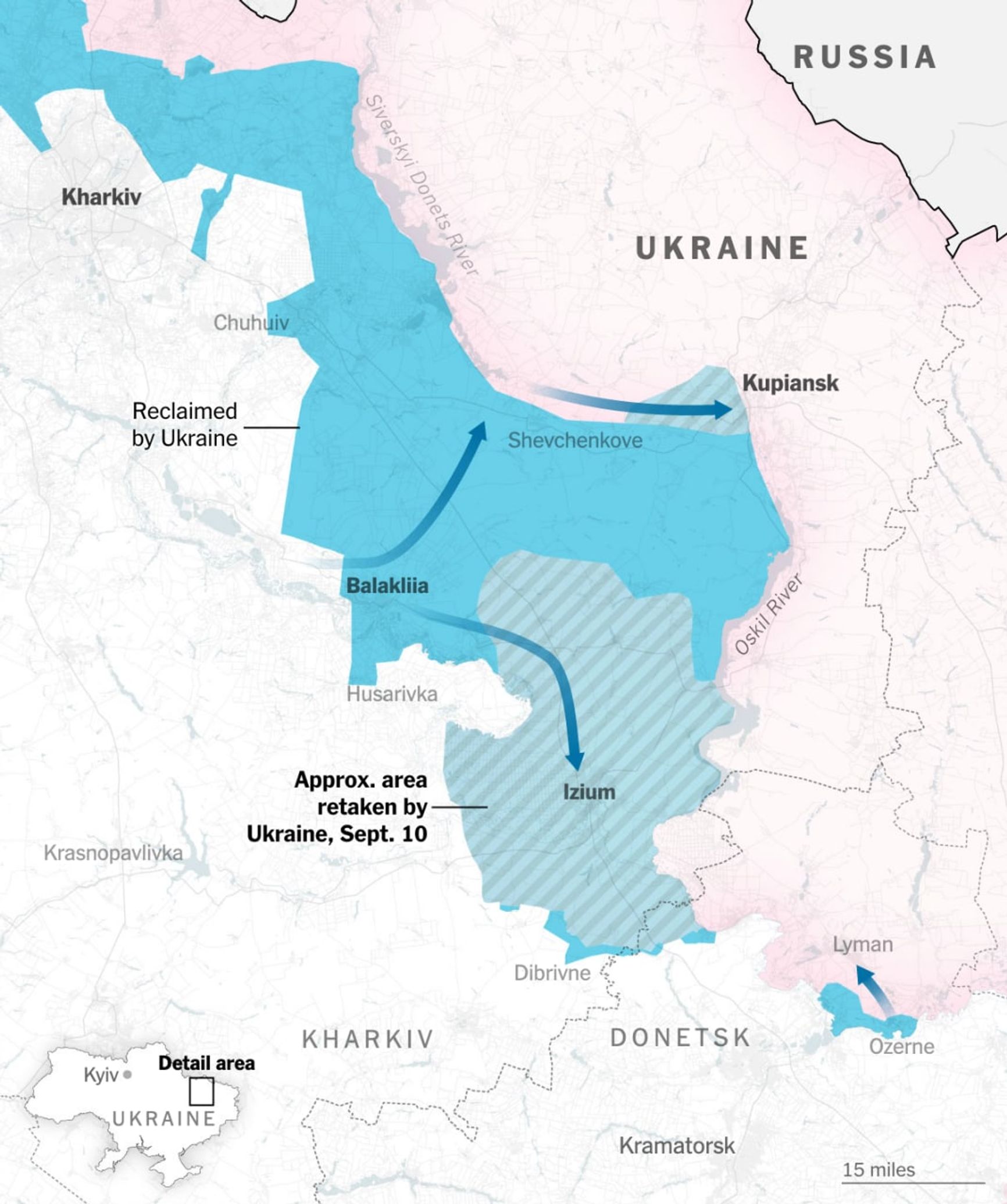 Опубликована карта с изображением примерного продвижения украинских войск на Харьковском направлении по состоянию на 10 сентября. Карту публикует The New York Times.
