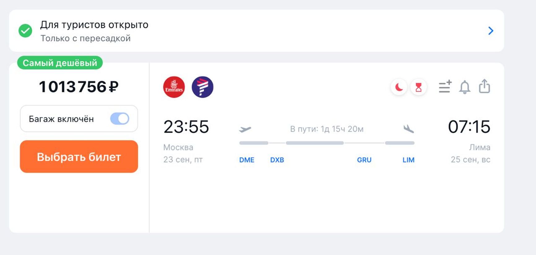 Если говорить о менее очевидных странах, открытых для россиян, то тут все точно так же. Билетов на 21 сентября нет в Таиланд, Израиль и даже Перу, где россиянам можно находиться без визы в течение 180 дней. Более того, билеты в Перу, а именно в Лиму, на ближайшие два дня стоят от 820 тысяч до миллиона рублей.