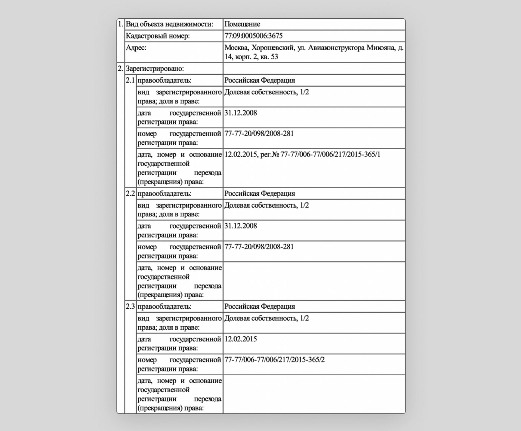 Одна из квартир Суровикина по адресу Авиаконструктора Микояна 14, корп. 2, согласно декларации, принадлежит его супруге и ребенку — доли распределены пополам. В то же время в выписках ЕГРН сообщается, что «Российская Федерация» делит квартиру на двоих сама с собой. В 2015‑м одна из долей перешла к третьей «Российской Федерации». Квадратный метр недвижимости в этом доме стоит около 427 тысяч рублей, то есть стоимость квартиры семьи Суровикиных площадью 107,5 кв. м может составлять 46 млн рублей.