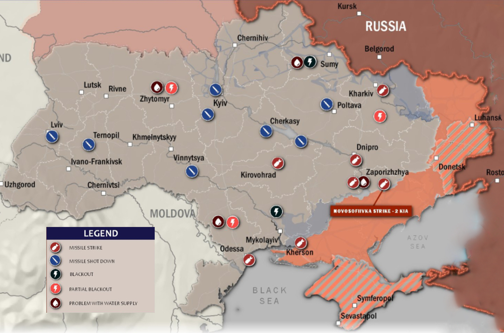 Воздушная тревога была объявлена во всех областях страны. После взрывов в Киевской области возникли проблемы со светом, частично обесточена Одесса, в Запорожье разрушены жилые дома. Взрывы были слышны в Черкасской, Винницкой, Кировоградской, Николаевской и Одесской областях. Также сообщается о «прилетах» в Одессе, Николаеве и Умани.