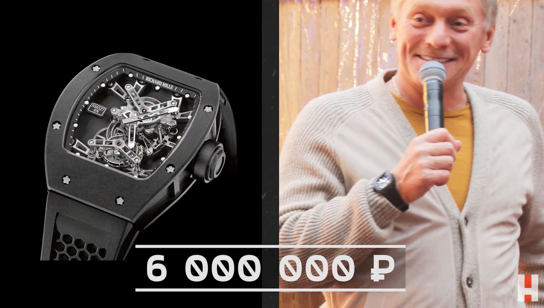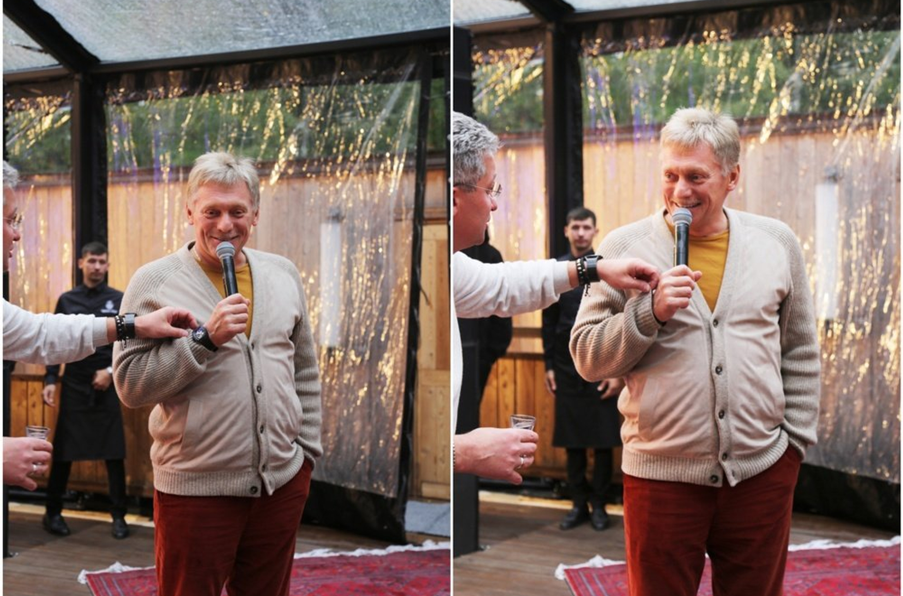 На дне рождения в 2021 году пресс-секретарь произнес тост и поздравил Иванову. При этом на руке у него были видны часы за 6 млн рублей — это половина дохода Пескова за год. На втором кадре видно, как замминистра обороны прикрывает дорогой аксессуар, натягивая кардиган Пескова на часы.
