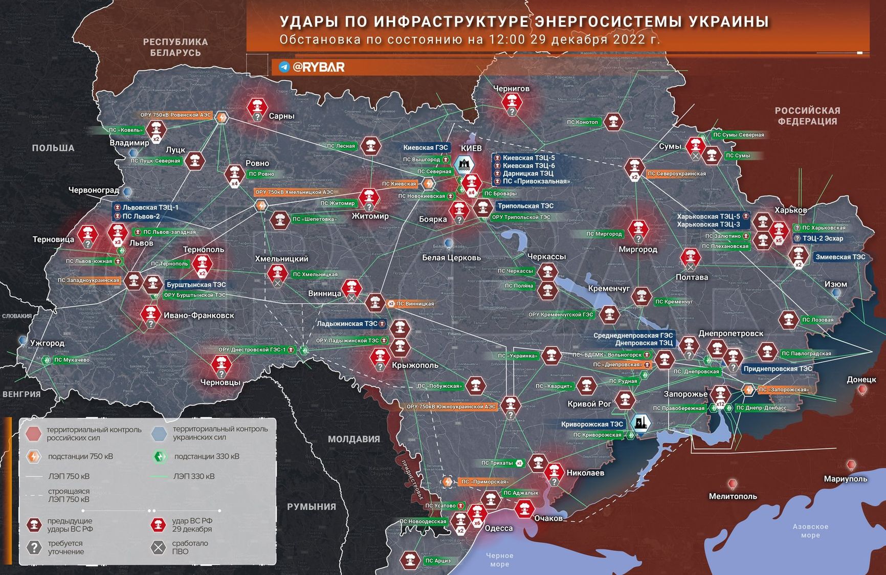 Утром 29 декабря Россия продолжила наносить удары, но уже ракетами. Как отмечает пророссийский Telegram-канал «Рыбарь», на этот раз целями массированного ракетного удара стали не только объекты энергетики, но и, по всей видимости, украинские позиционные районы ПВО.