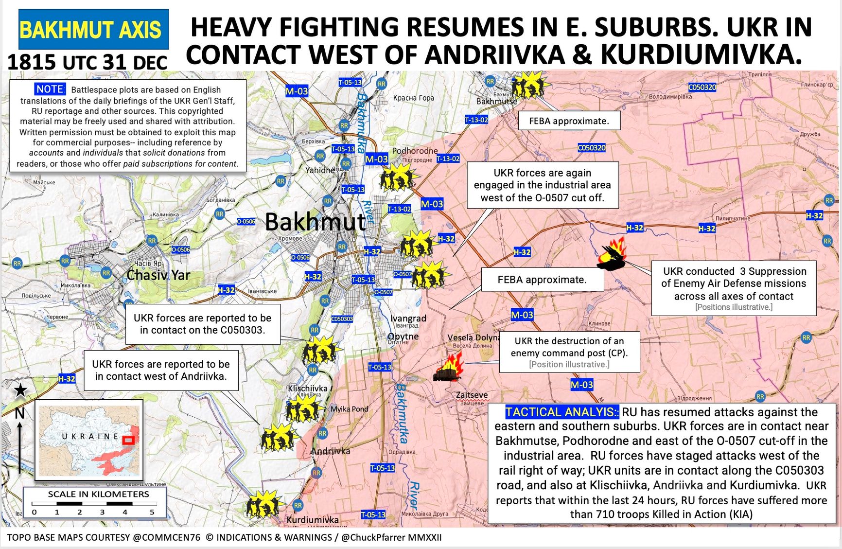Военный аналитик, бывший командир подразделения ВМС США Чак Пфаррер утверждает, что Россия возобновила массированные атаки на восточных и южных окраинах Бахмута. В Луганской области, в районе Сватово и Кременной, украинские силы наблюдают, как части РФ отступают до села Змиевка, отмечает Пфаррер. По его словам, за 30-31 декабря Россия потеряла несколько боевых машин, а также два новых боевых танка Т-90.