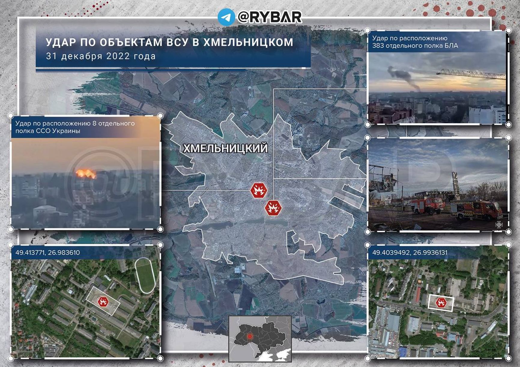 Пропагандистский Telegram-канал «Рыбарь» утверждает, что в ходе обстрелов города Хмельницкий 31 декабря российская ракета поразила расположение 8 отдельного полка ССО Украины (в/ч А0553). Целью второго российского удара, по данным пророссийского военного аналитика, было расположение 383 отдельного полка БЛА (в/ч А3808), оснащенного беспилотниками Ту-141 и Ту-143.
