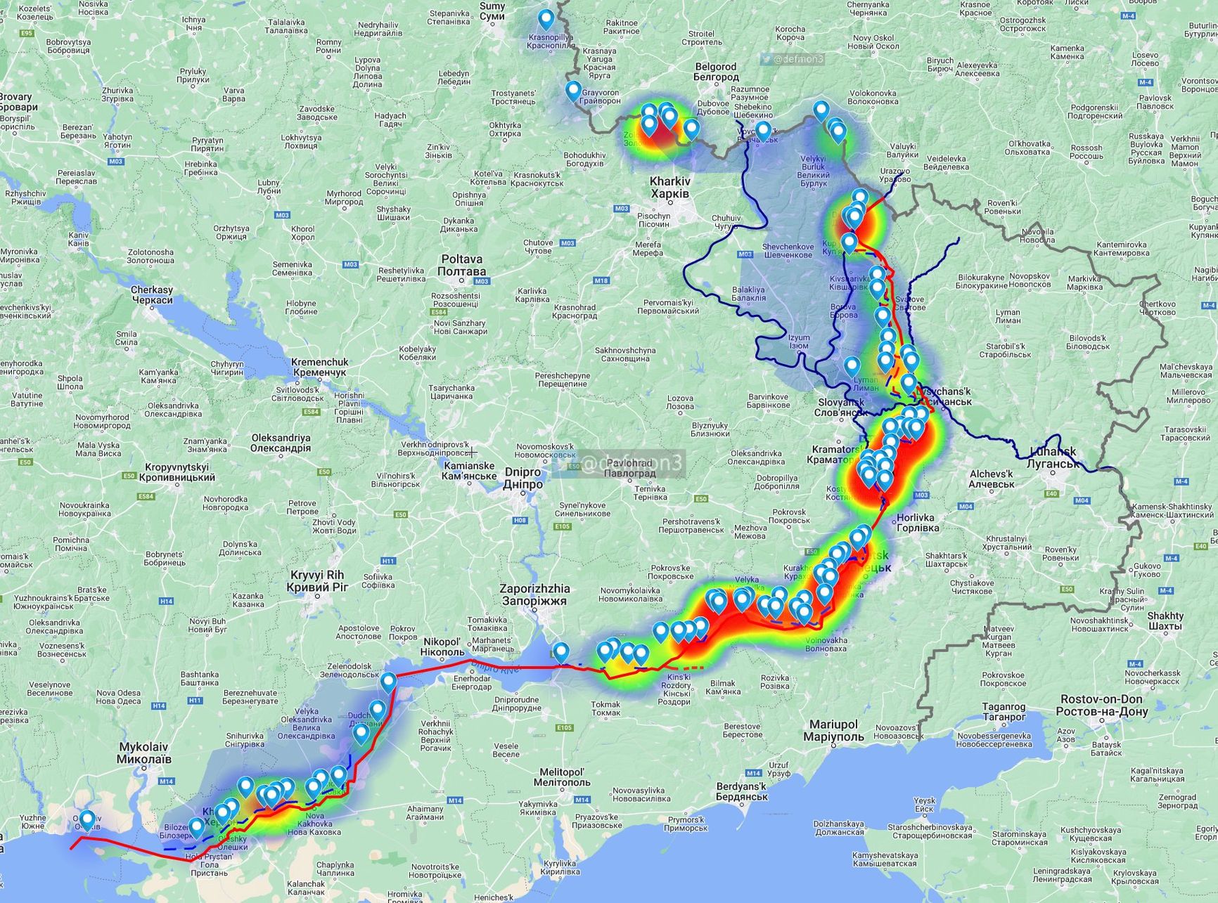 Анонимный OSINT-специалист Def Mon публикует карту, которая показывает все места обстрелов, о которых сообщил за день Генштаб ВСУ.