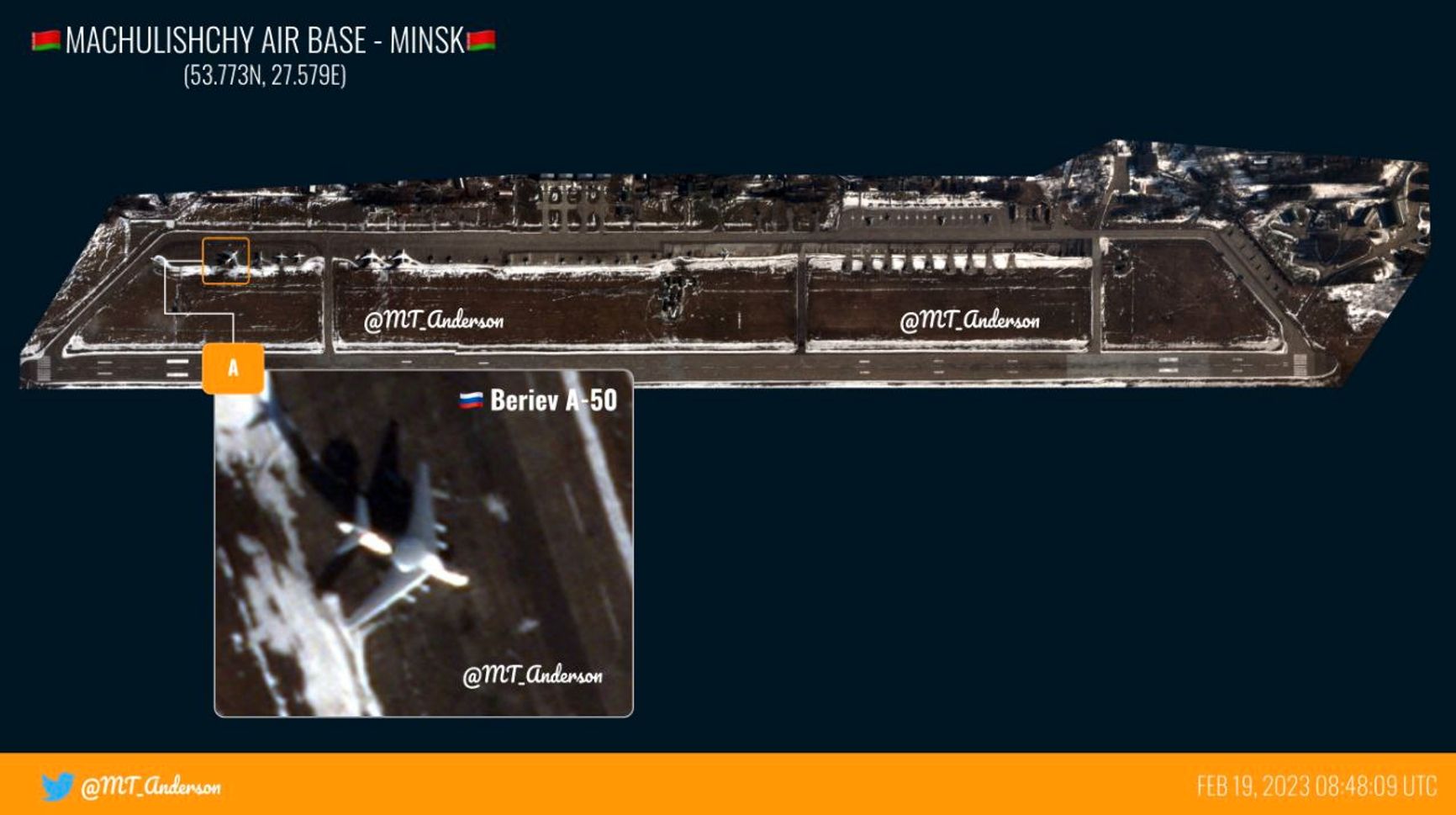 По данным организации, в результате двух взрывов пострадали передняя и центральная часть самолета, повреждены авионика и радиолокационная антенна. Утверждается, что повреждения серьезные и летать А-50 уже не сможет. Motolko.Help пишет, что в результате взрывов пострадал российский самолет ДРЛО А-50У с регистрационным номером RF-50608. Борт прилетел в Беларусь 3 января и с тех пор сделал 12 вылетов. Этот же борт прилетал в Беларусь 24 февраля 2022 года.