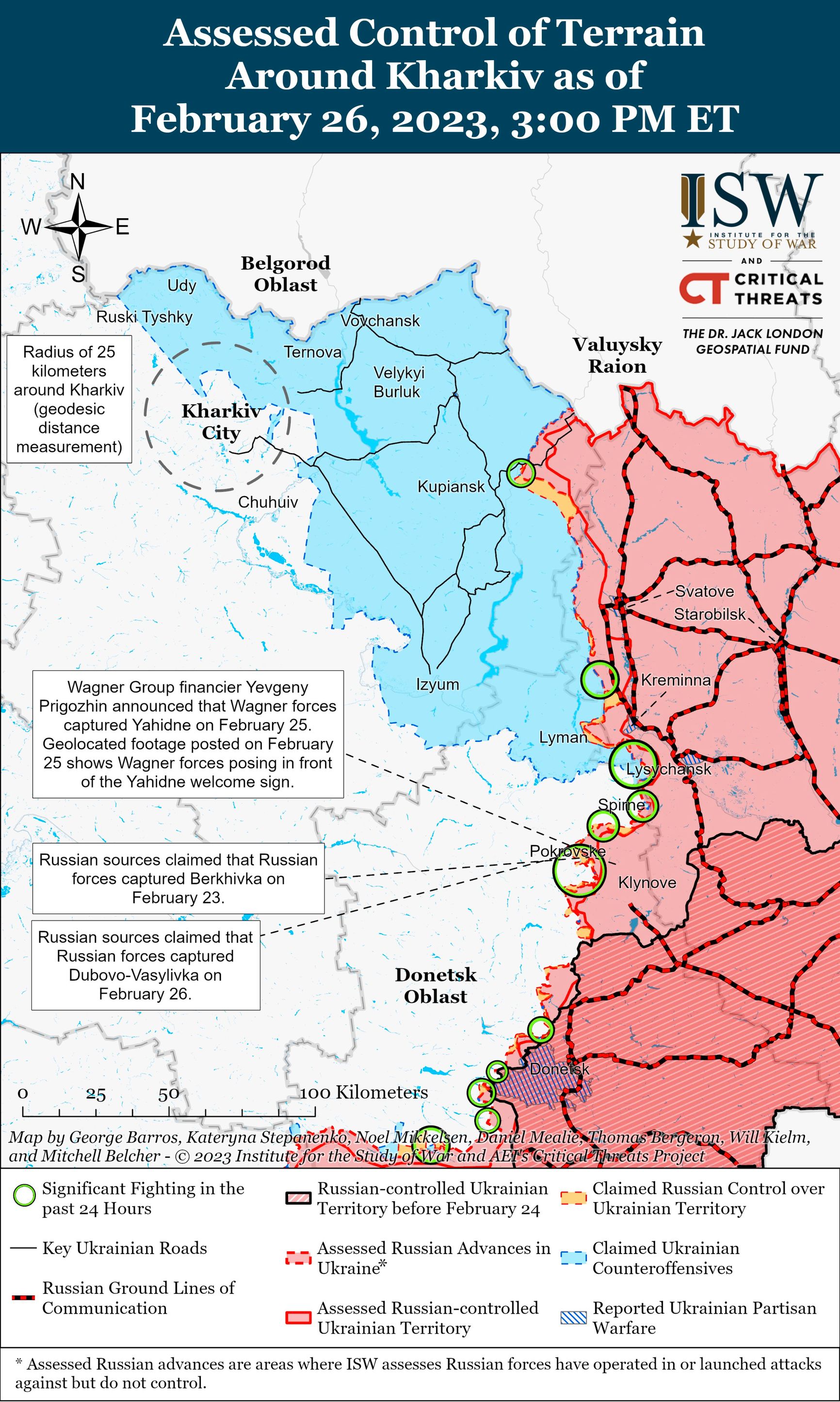 Несмотря на то, что основные пути снабжения были перерезаны, Бахмут в ближайшие дни вряд ли будет захвачен, отмечают аналитики Conflict Intelligence Team (CIT) в своей сводке. Снижение интенсивности боевых действий, вероятно, связано со «снарядным голодом». По данным CIT, дефицит затронул не только наемников ЧВК Вагнера, но и регулярные части.